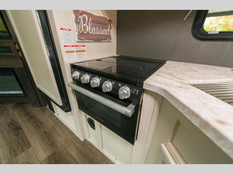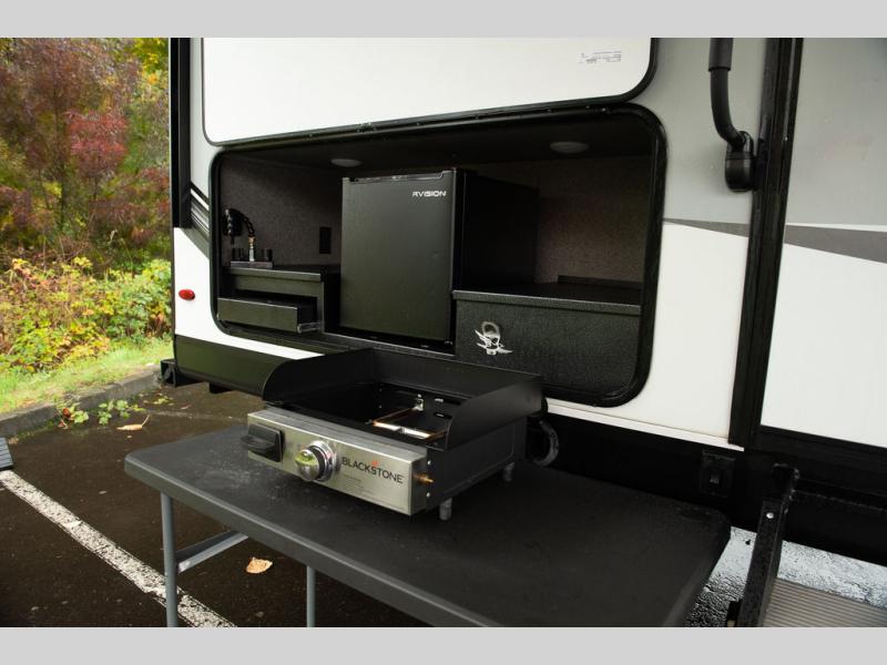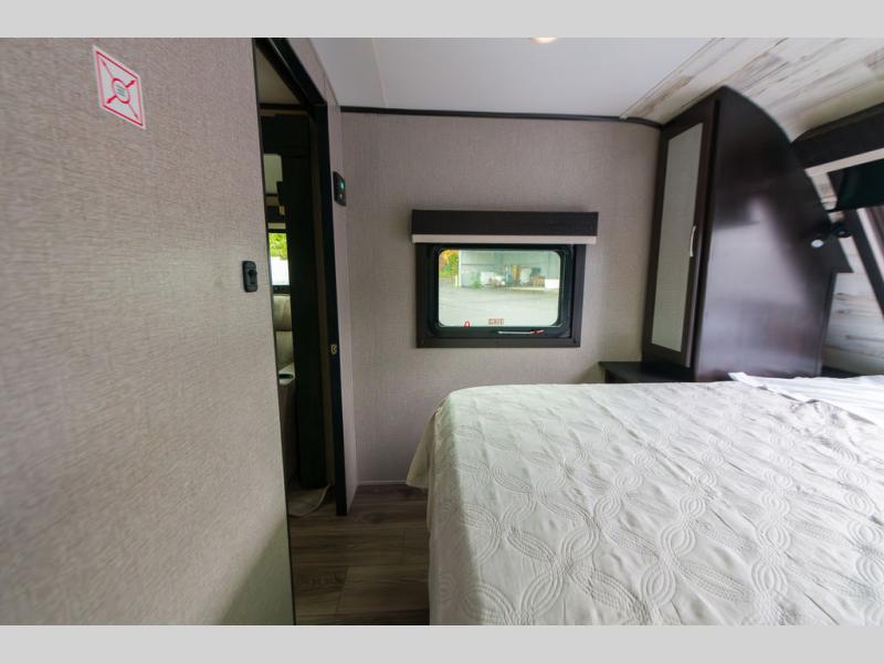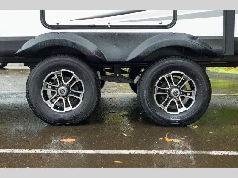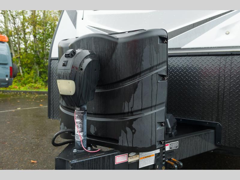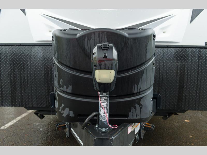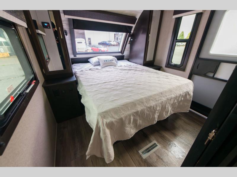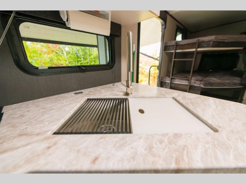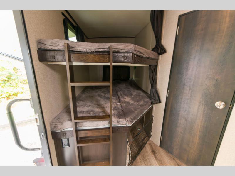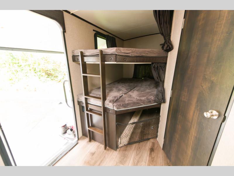 There is something for everyone in this travel trailer! From the double-over-double bunks with a 600 lb. weight rating per bunk with storage below the bottom bunk to the outside kitchen and dual entry doors. The rear corner bathroom is spacious with a glass 34" radius shower that has a skylight above for natural lighting as you get ready and a linen closet to keep your linens close by. You will feel right at home in the front private bedroom with a queen bed that has plenty of walk-around space and a walk-in closet to keep your clothes looking their best. Grab a drink from the 8 cu. ft. refrigerator, fry some bacon on the three burner Furrion glass cooktop, and then head outside and relax underneath the 21' electric awning!