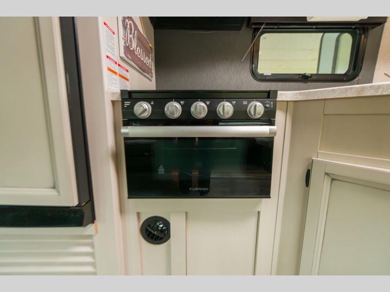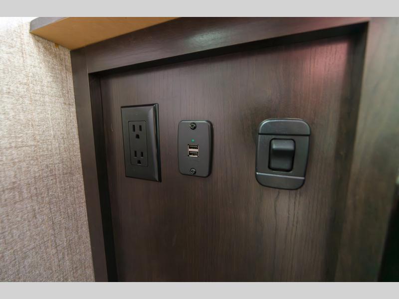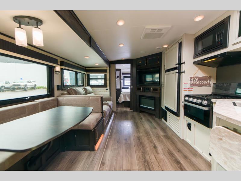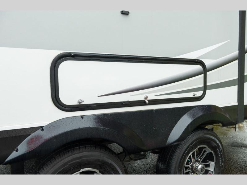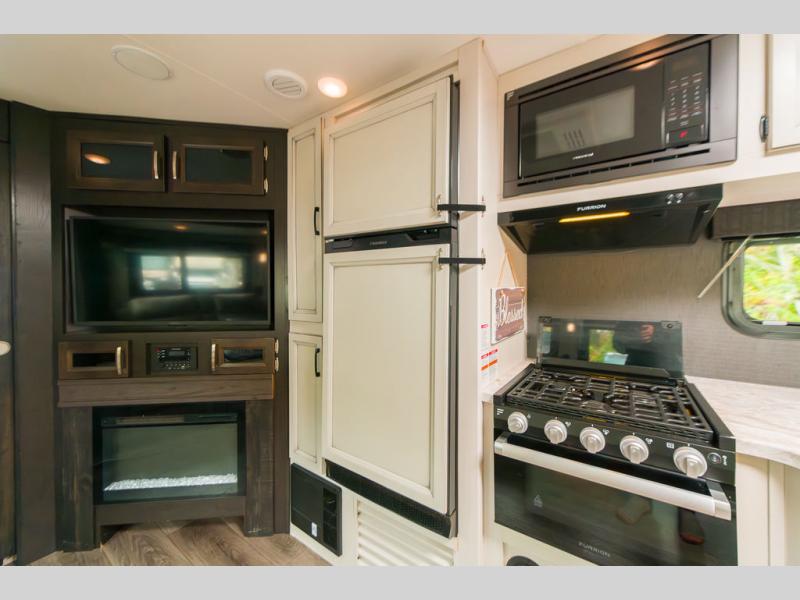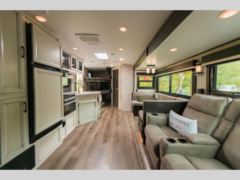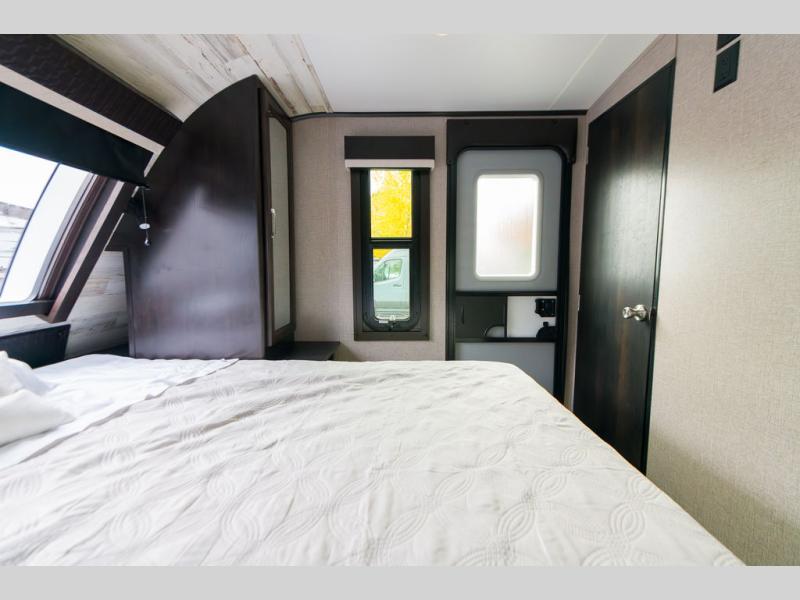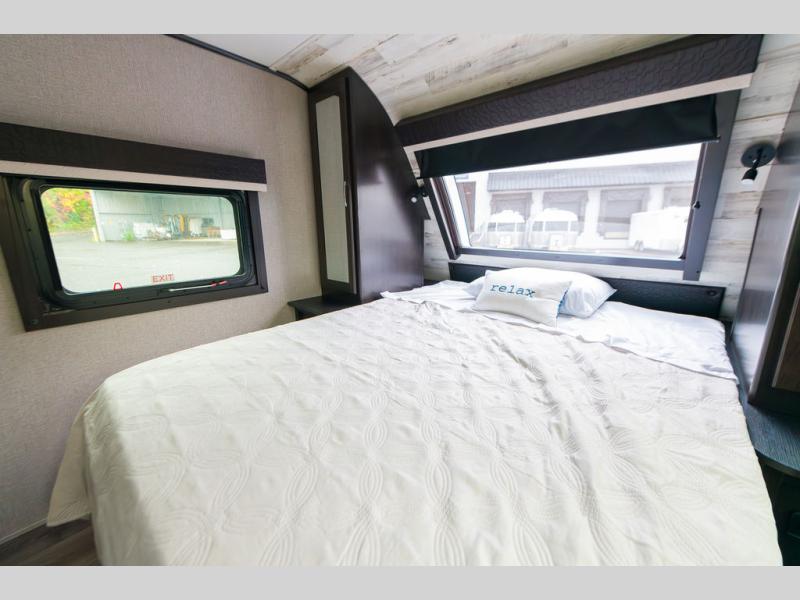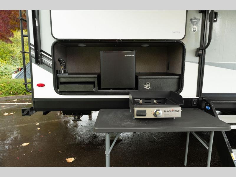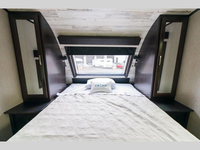 There is something for everyone in this travel trailer! From the double-over-double bunks with a 600 lb. weight rating per bunk with storage below the bottom bunk to the outside kitchen and dual entry doors. The rear corner bathroom is spacious with a glass 34" radius shower that has a skylight above for natural lighting as you get ready and a linen closet to keep your linens close by. You will feel right at home in the front private bedroom with a queen bed that has plenty of walk-around space and a walk-in closet to keep your clothes looking their best. Grab a drink from the 8 cu. ft. refrigerator, fry some bacon on the three burner Furrion glass cooktop, and then head outside and relax underneath the 21' electric awning!