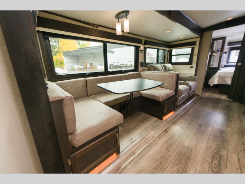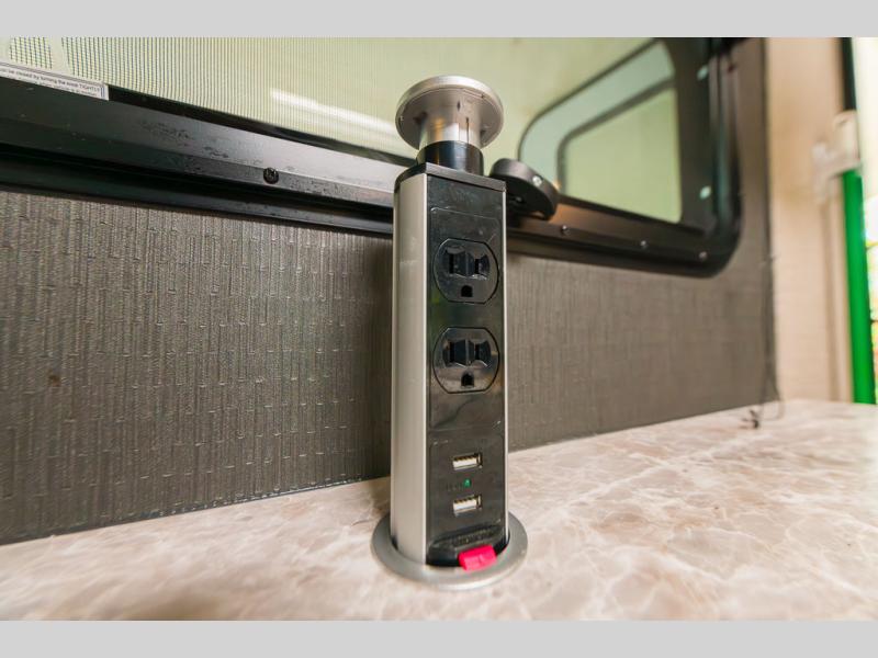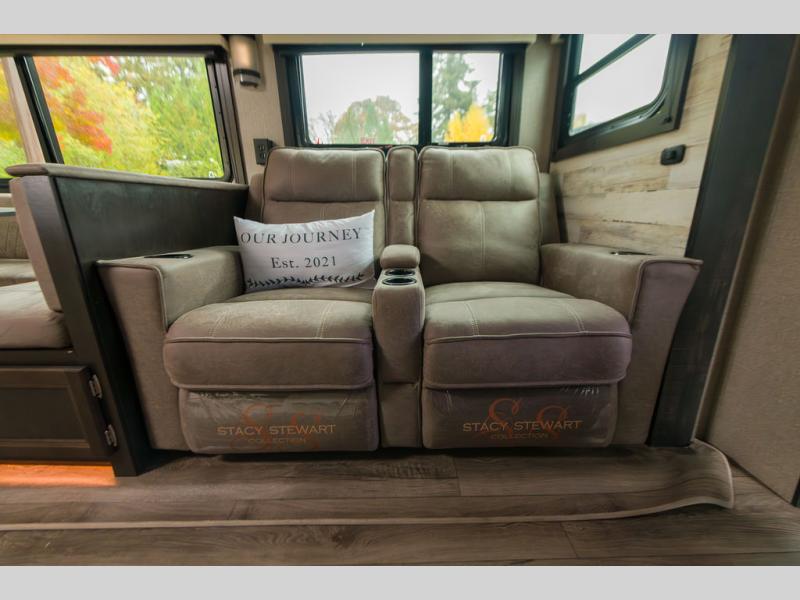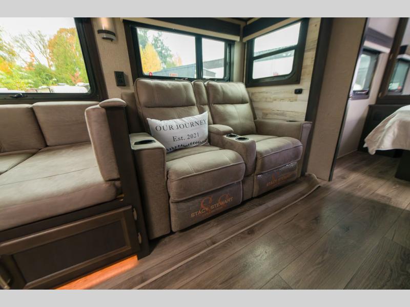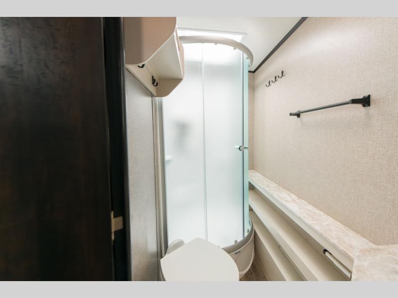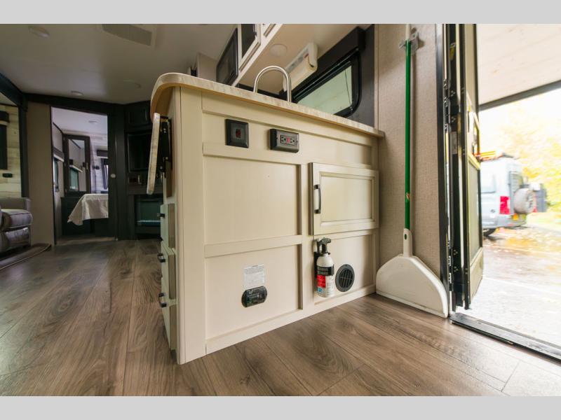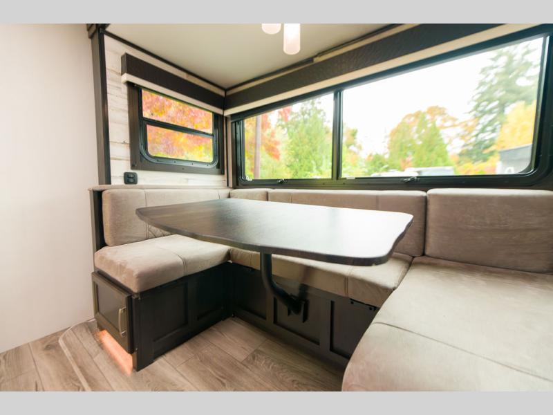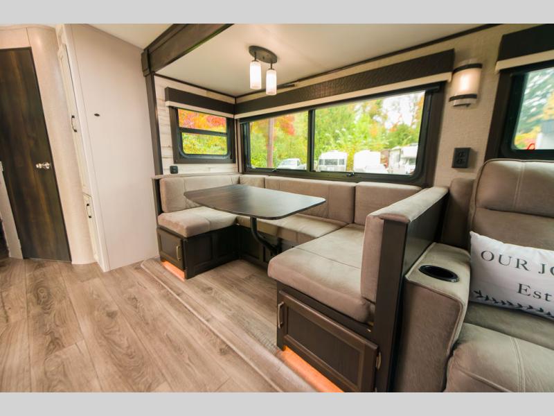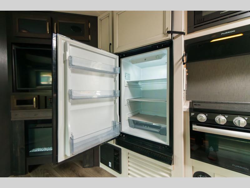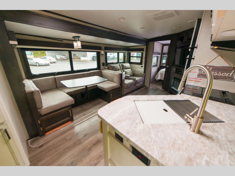 There is something for everyone in this travel trailer! From the double-over-double bunks with a 600 lb. weight rating per bunk with storage below the bottom bunk to the outside kitchen and dual entry doors. The rear corner bathroom is spacious with a glass 34" radius shower that has a skylight above for natural lighting as you get ready and a linen closet to keep your linens close by. You will feel right at home in the front private bedroom with a queen bed that has plenty of walk-around space and a walk-in closet to keep your clothes looking their best. Grab a drink from the 8 cu. ft. refrigerator, fry some bacon on the three burner Furrion glass cooktop, and then head outside and relax underneath the 21' electric awning!
