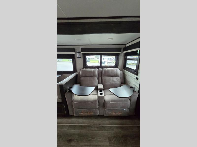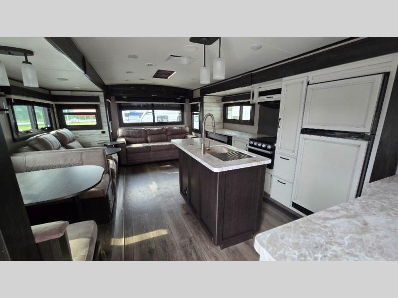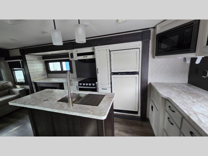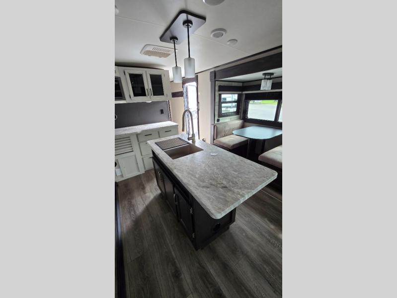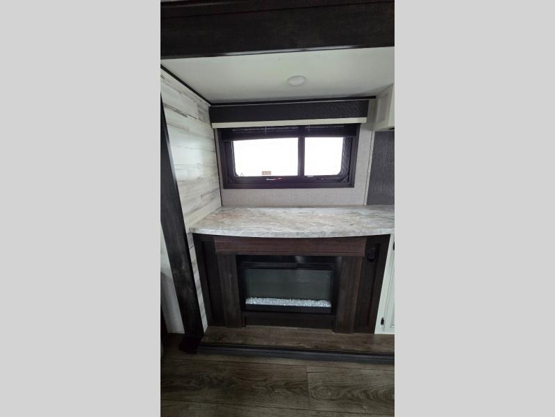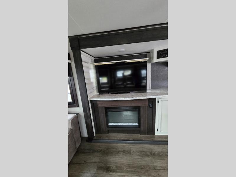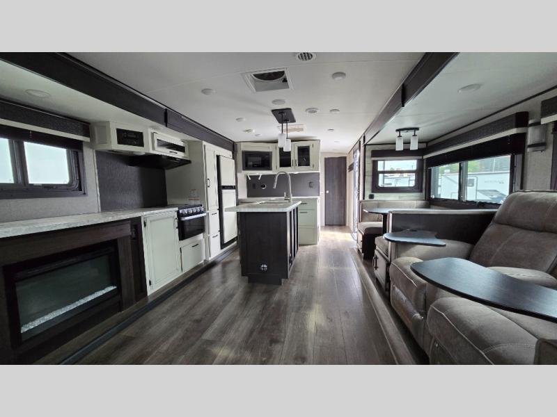 You won't want to camp any other way once you step foot inside this travel trailer with features like the kitchen island with a bar stool at the end and a double sink to make clean up easier! After you have created a delicious home cooked meal with the three burner Furrion glass cooktop, you can head to the booth dinette and enjoy eating it there comfortably. If there happens to be any leftovers you can store them in the 8 cu. ft. refrigerator and then relax on either the tri-fold sofa or the theater seating directly across from the entertainment center with a 50" LED TV and an electric fireplace. The spacious dual entry bathroom has a glass 34" radius shower with a skylight above to let in some natural lighting, a linen closet to keep your towels close by, and an entrance into the front private bedroom. The front private bedroom will meet your storage needs with three wardrobes, and you will enjoy a good night's rest each night on the comfortable queen bed!