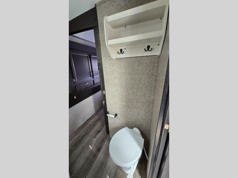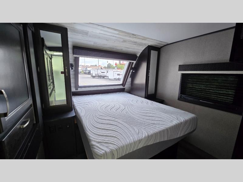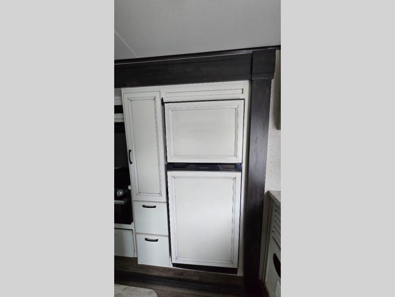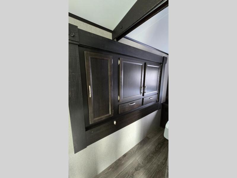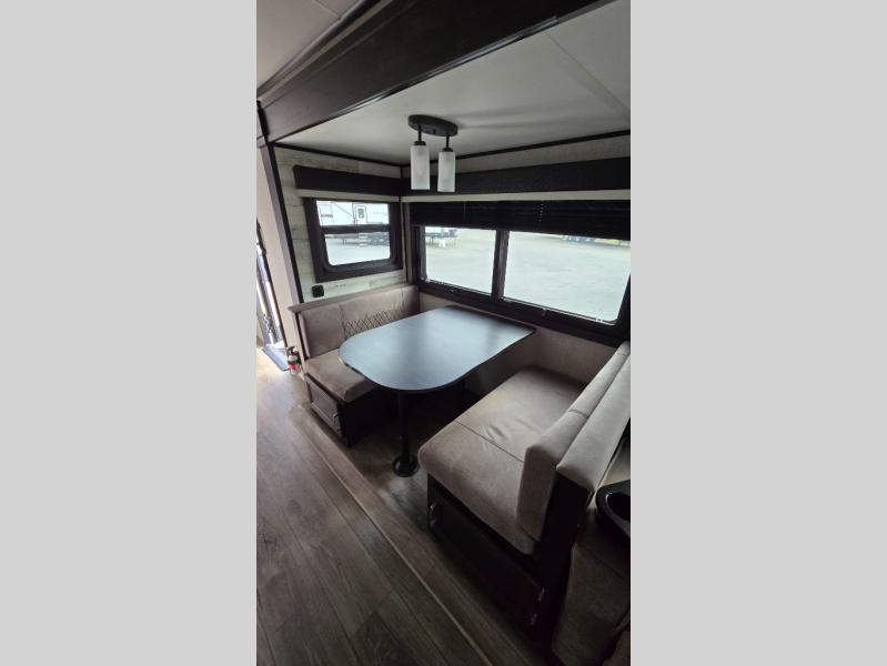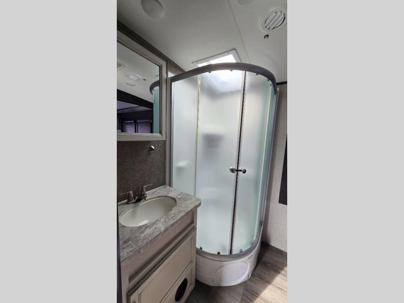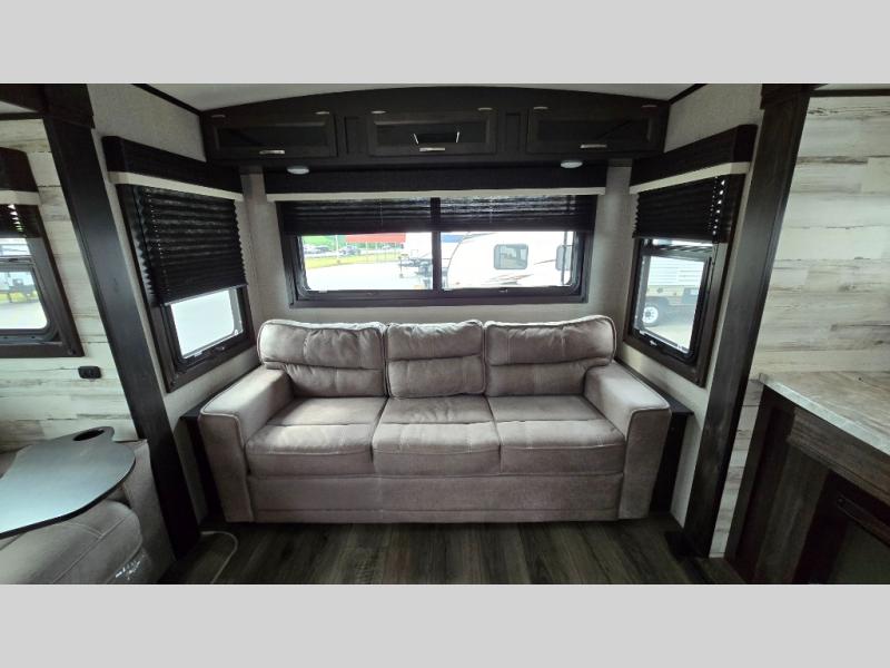 You won't want to camp any other way once you step foot inside this travel trailer with features like the kitchen island with a bar stool at the end and a double sink to make clean up easier! After you have created a delicious home cooked meal with the three burner Furrion glass cooktop, you can head to the booth dinette and enjoy eating it there comfortably. If there happens to be any leftovers you can store them in the 8 cu. ft. refrigerator and then relax on either the tri-fold sofa or the theater seating directly across from the entertainment center with a 50" LED TV and an electric fireplace. The spacious dual entry bathroom has a glass 34" radius shower with a skylight above to let in some natural lighting, a linen closet to keep your towels close by, and an entrance into the front private bedroom. The front private bedroom will meet your storage needs with three wardrobes, and you will enjoy a good night's rest each night on the comfortable queen bed!