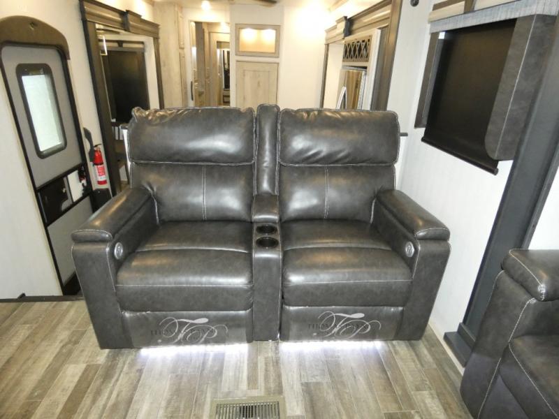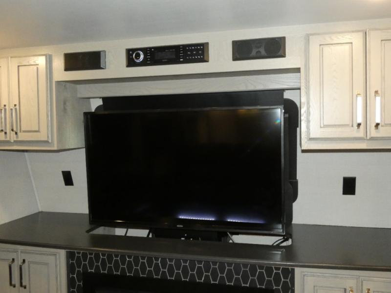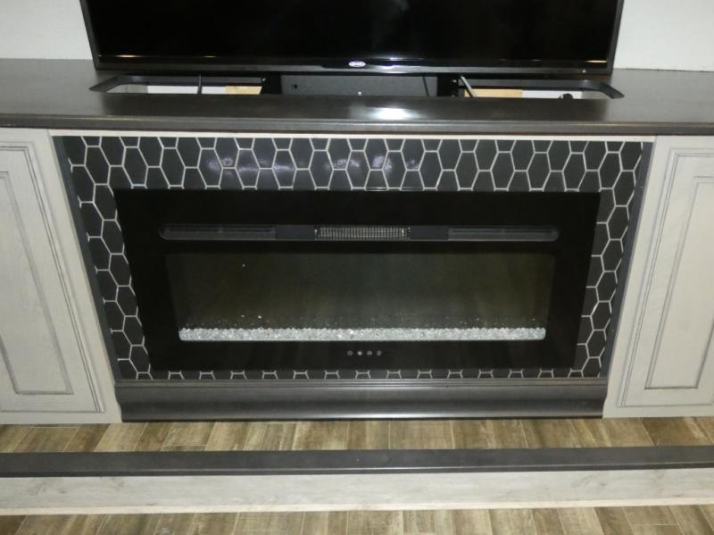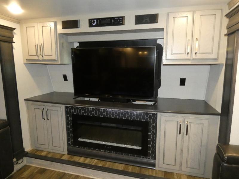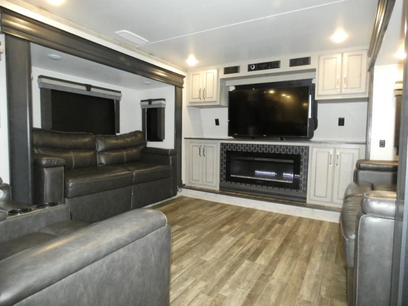 Come see just how fun and easy camping can be with this luxurious five-slide Alpine fifth wheel by Keystone RV. Getting ready for the day is easy with a large master bathroom that has two sinks, plenty of counter space, and a shower with a seat. You'll find the second half bathroom is conveniently located just off of the kitchen for your guests. In the kitchen area, you will find dual opposing slides and all of the amenities you need to fix your favorite meals, such as a convection microwave, and a fridge. Step up to the front living room where you will find two tri-fold sofa sleepers, theater seats, a fireplace, and an entertainment center with a 50" LED TV.