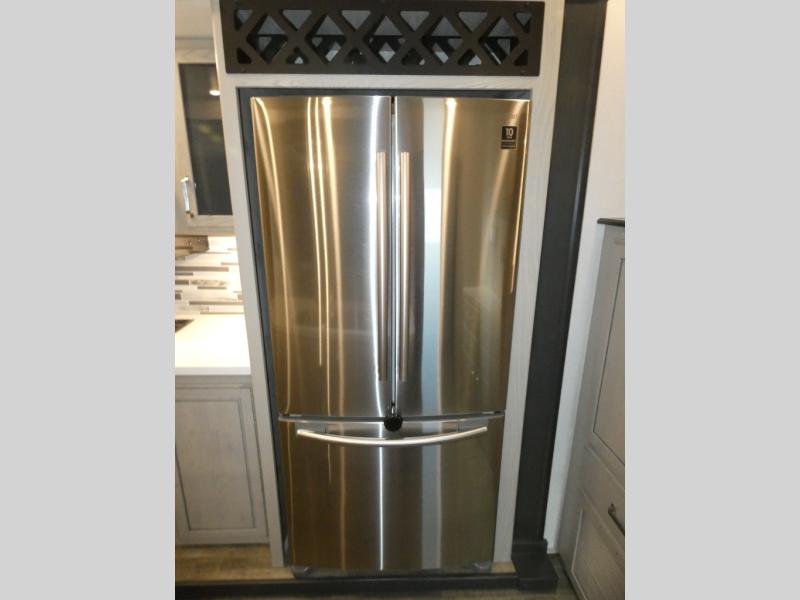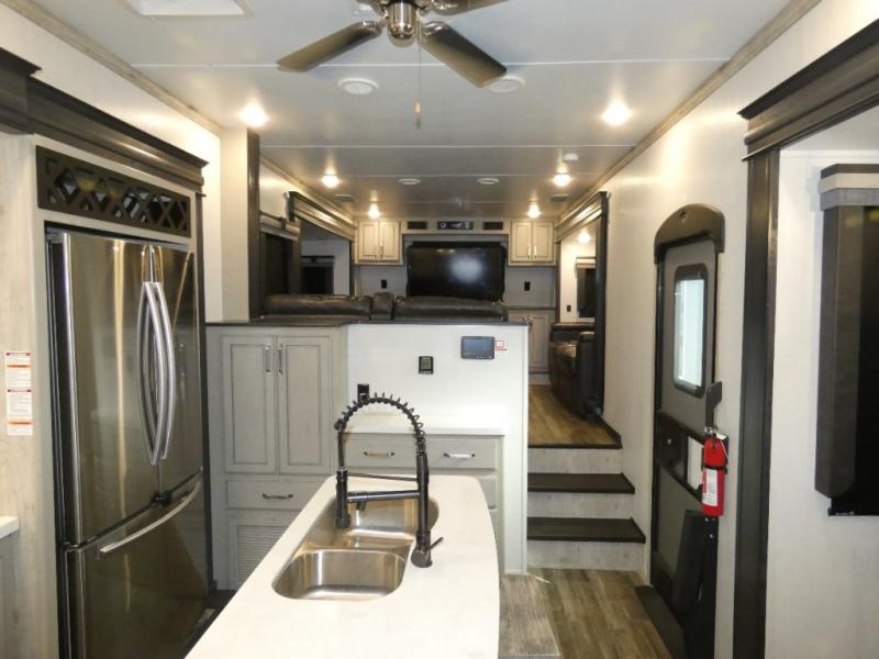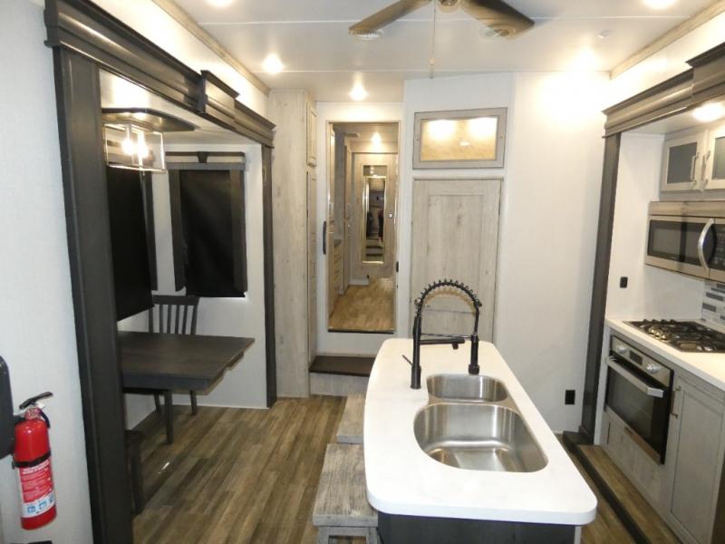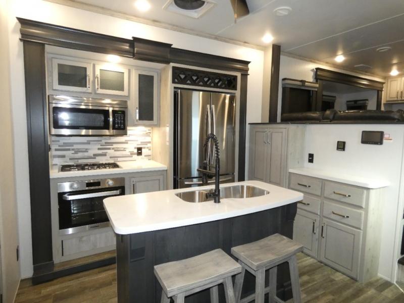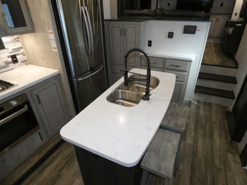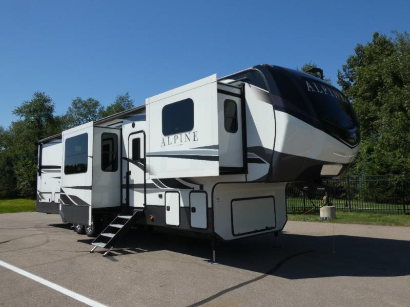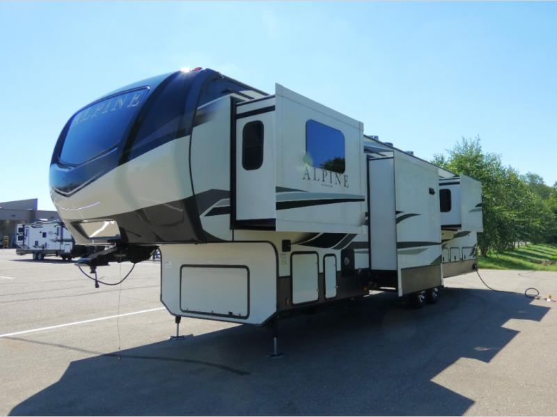 When you choose an Alpine fifth wheel by Keystone RV, you are choosing luxury, innovation, modern style and so much more! The stunning Aspen Oak cabinetry with contrasting Renewed Oak accents and vintage wire mesh glass inserts, the polished natural stone solid surface countertops, and the varied plank width resilient flooring throughout are just a few highlights inside. Some other noteworthy features include the high-fidelity video and audio to withstand road vibration with three, separately controlled sound zones with smartphone app capability, and the iN-Command system with oversized touchscreen monitor giving you control of the slides, awnings, and HVAC. Each Alpine is built with 100" wide body construction, a dual 15,000 BTU Whisper Quiet A/C system, a Nautilus On-Demand water heater for instant, endless hot water, and insulated wrapped tanks with 12 volt heat pads allowing you to travel every season.