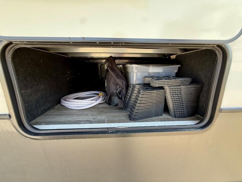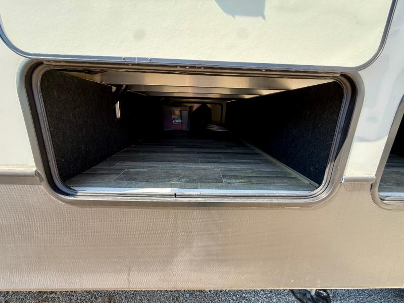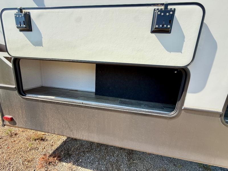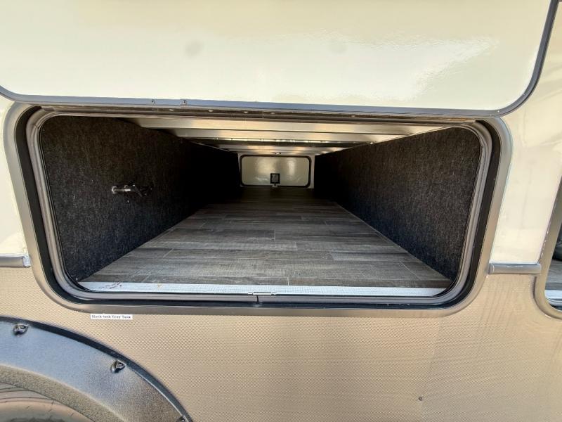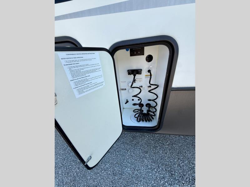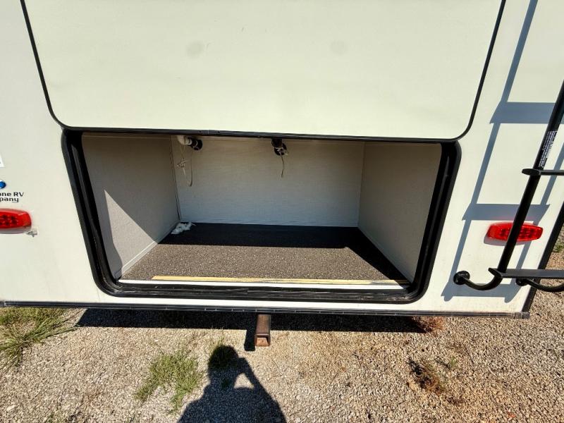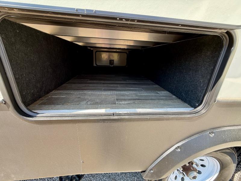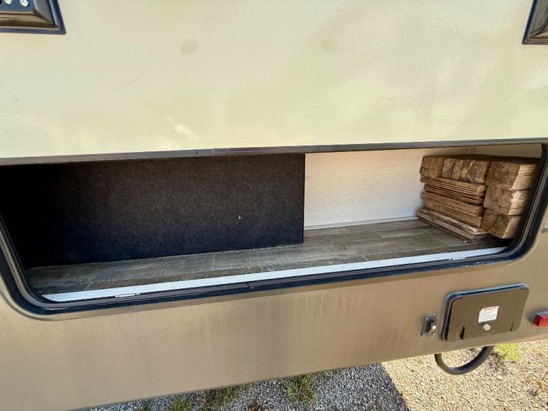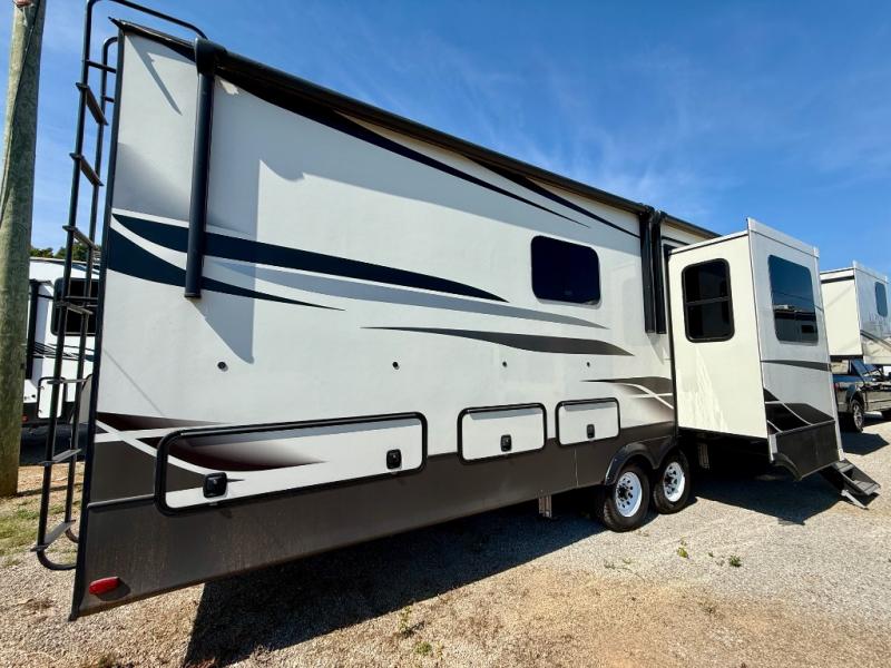 There's something for everyone in this fifth wheel! The chef will love cooking in the front kitchen with the extra counter space and patent-pending windshield, the convection microwave, the large pantry, and the 18 cubic foot refrigerator or choose the residential option, plus there is a breakfast bar that overlooks the middle living area. The living area welcomes you to a relaxing evening by laying on one of the opposing tri-fold sofa sleepers or on the theater seating across from the entertainment center with a fireplace. The walk-through bedroom has a king bed with storage underneath, two wardrobes, and a chest, as well as access to the rear full bathroom. The bathroom features a double sink vanity for two to get ready at once, a large shower, and even a space that is prepped for you to add the optional washer and dryer!