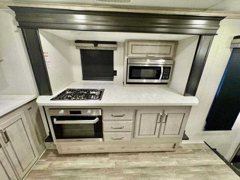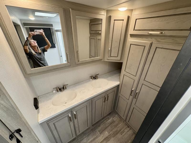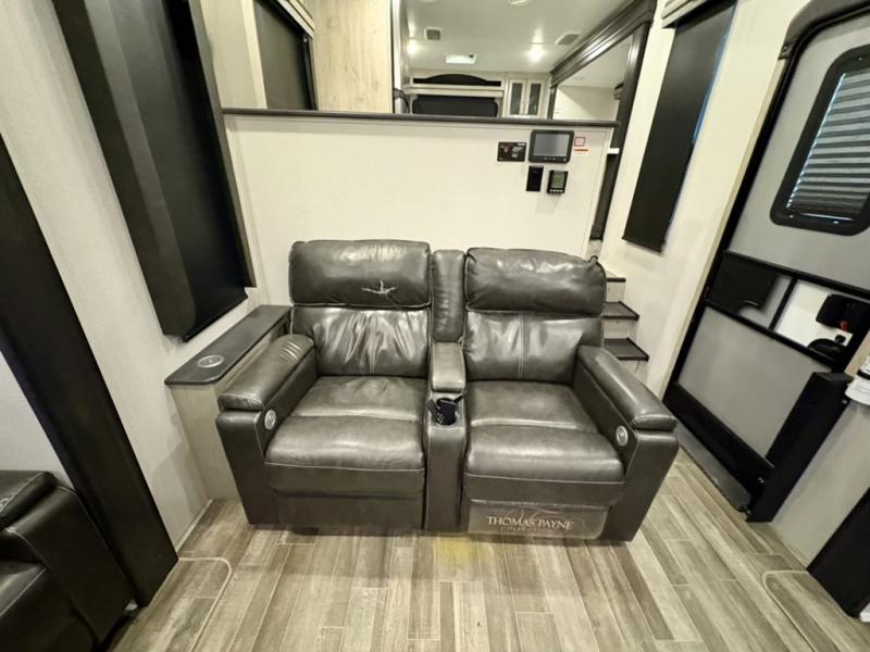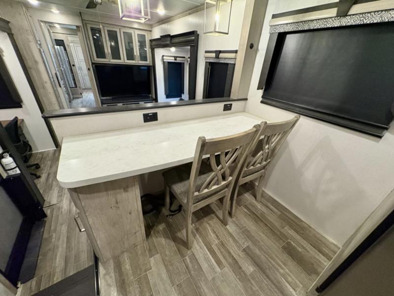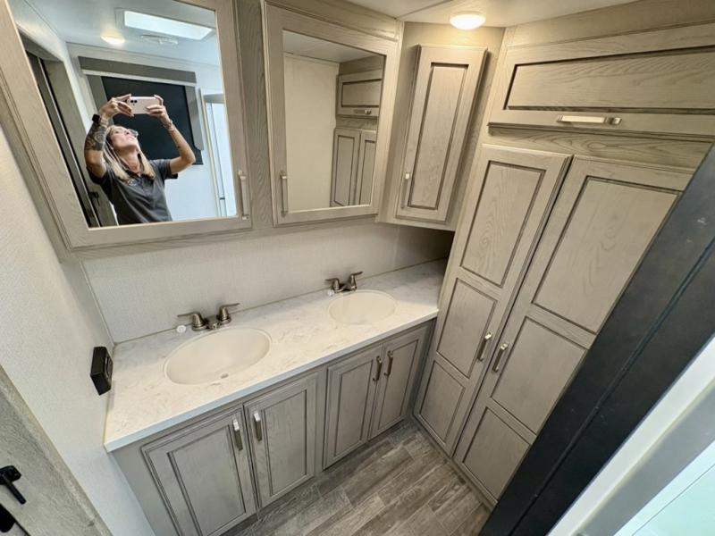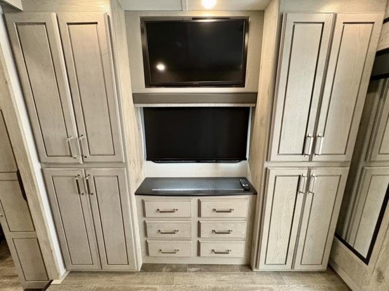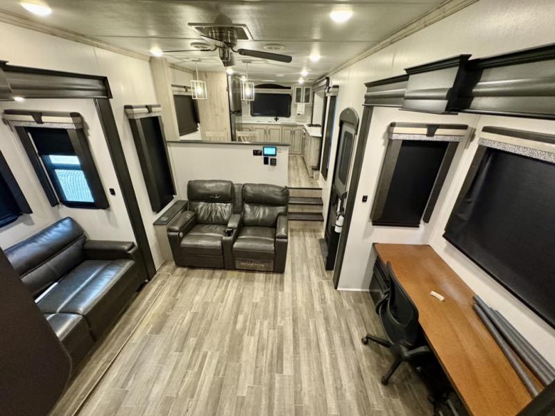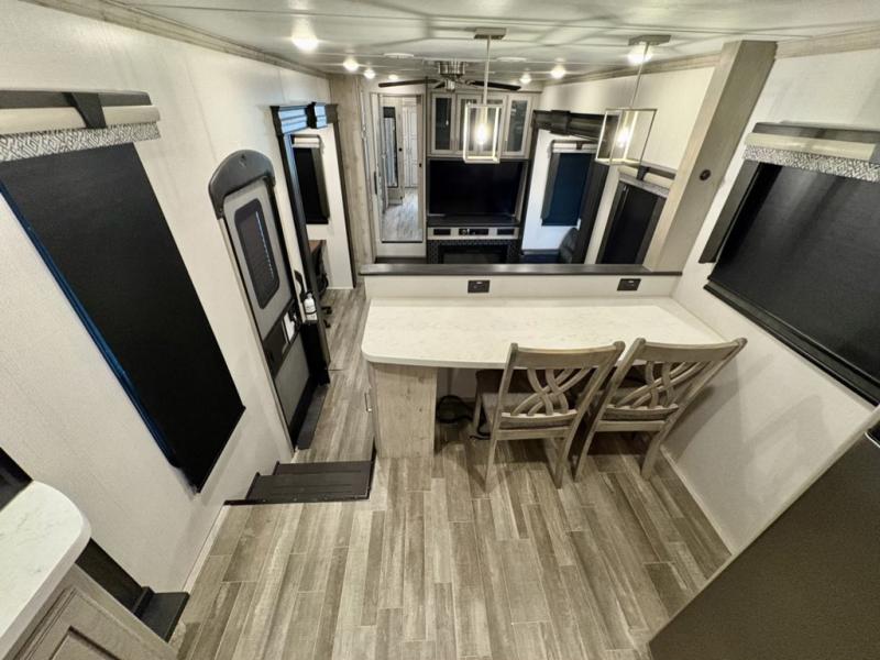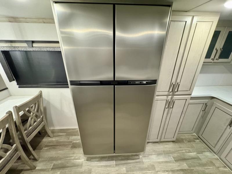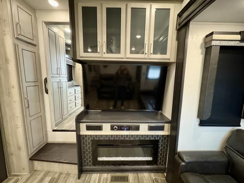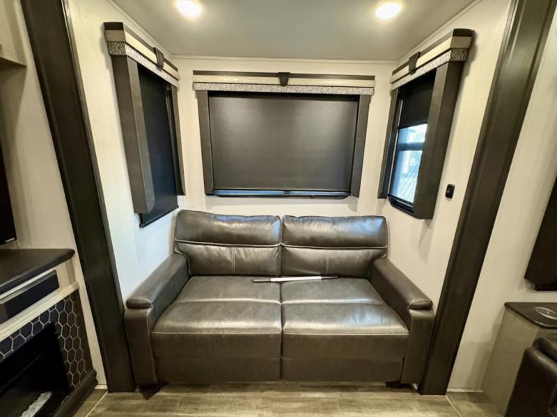 There's something for everyone in this fifth wheel! The chef will love cooking in the front kitchen with the extra counter space and patent-pending windshield, the convection microwave, the large pantry, and the 18 cubic foot refrigerator or choose the residential option, plus there is a breakfast bar that overlooks the middle living area. The living area welcomes you to a relaxing evening by laying on one of the opposing tri-fold sofa sleepers or on the theater seating across from the entertainment center with a fireplace. The walk-through bedroom has a king bed with storage underneath, two wardrobes, and a chest, as well as access to the rear full bathroom. The bathroom features a double sink vanity for two to get ready at once, a large shower, and even a space that is prepped for you to add the optional washer and dryer!