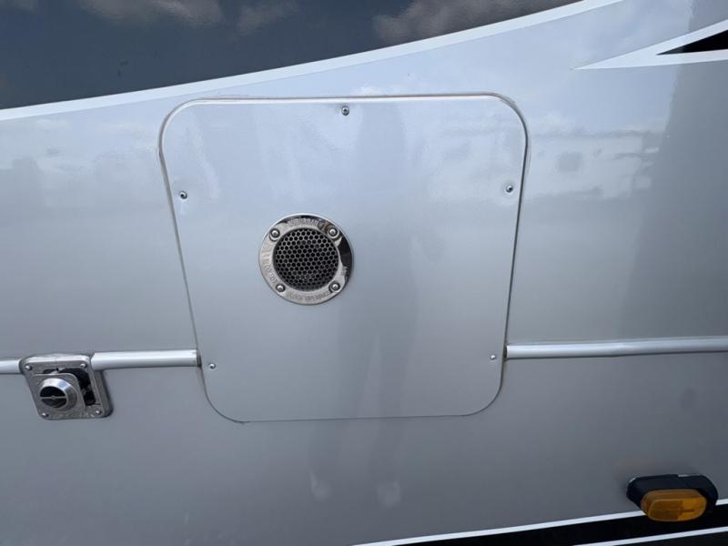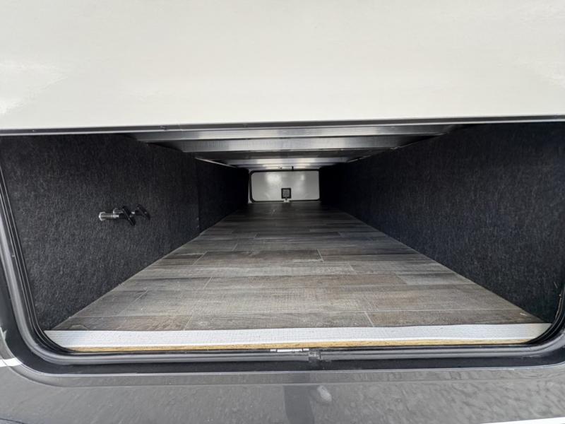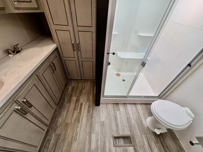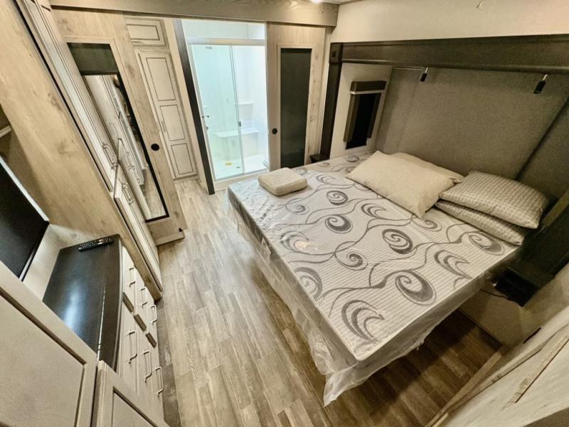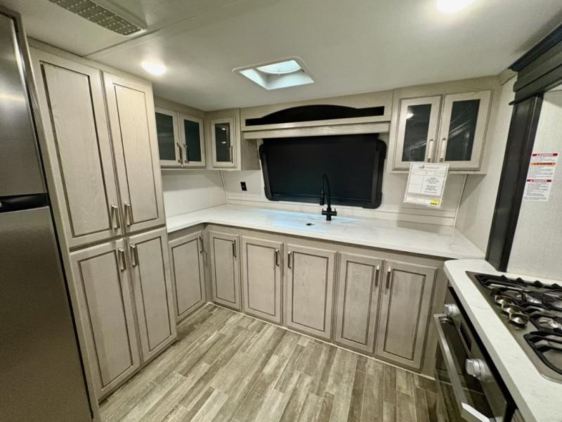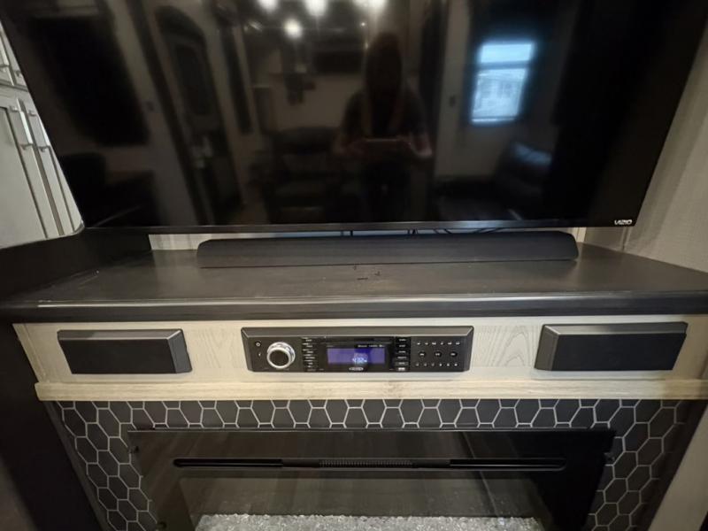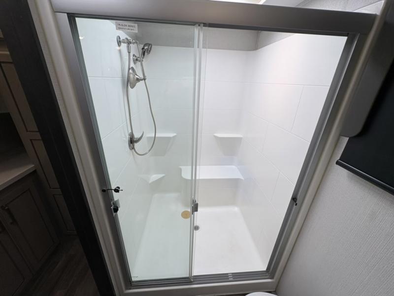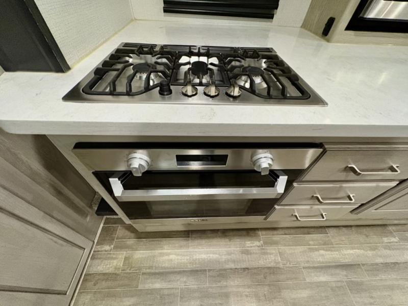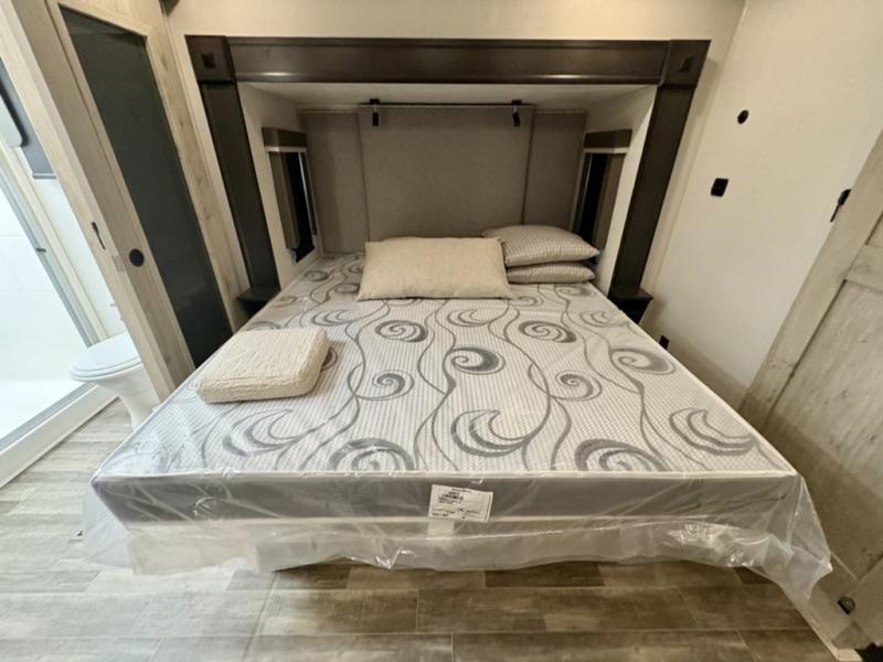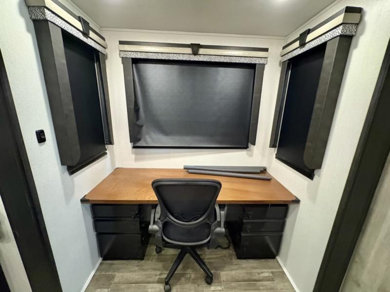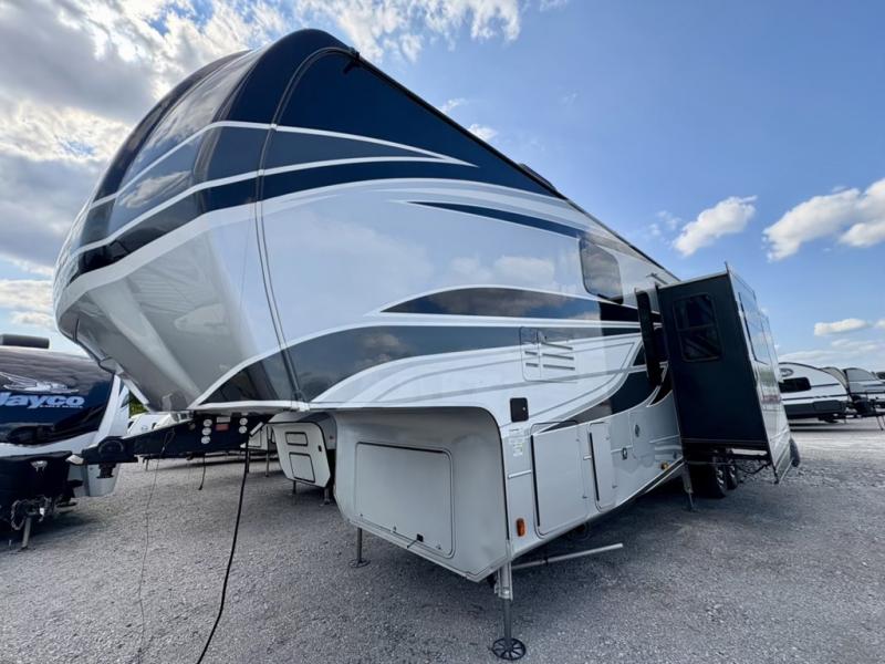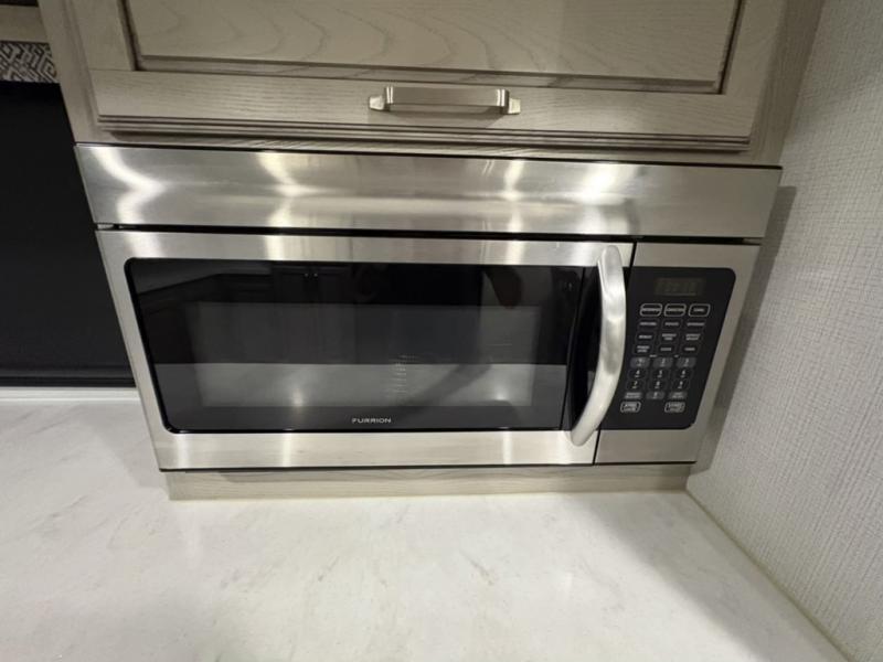 There's something for everyone in this fifth wheel! The chef will love cooking in the front kitchen with the extra counter space and patent-pending windshield, the convection microwave, the large pantry, and the 18 cubic foot refrigerator or choose the residential option, plus there is a breakfast bar that overlooks the middle living area. The living area welcomes you to a relaxing evening by laying on one of the opposing tri-fold sofa sleepers or on the theater seating across from the entertainment center with a fireplace. The walk-through bedroom has a king bed with storage underneath, two wardrobes, and a chest, as well as access to the rear full bathroom. The bathroom features a double sink vanity for two to get ready at once, a large shower, and even a space that is prepped for you to add the optional washer and dryer!
