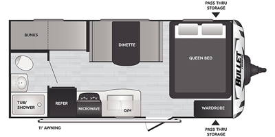 Take a break from your stressful, busy life and enjoy a weekend getaway with your family or friends in this Bullet Crossfire travel trailer. With its set of bunk beds, booth dinette, and queen-size bed, this trailer gives you plenty of room to sleep five people comfortably along the way, and with the full bathroom and kitchen amenities, there isn't a need that won't be met when traveling with this trailer. You will also appreciate having an 11' electric awning to protect you from the outdoor elements during the day or night.