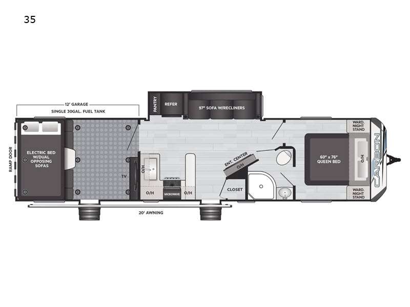 The new look of the Keystone Carbon toy hauler is clean, sporty, and optimistic! This brand is geared towards those who enjoy an active lifestyle, and the new exterior graphics package perfectly displays that spirit. The Carbon now comes with the Blade high-performance air handling system which has been engineered by Keystone to deliver an average of 20% more cooling power by accelerating air flow, eliminating leakage, and delivering 360-degree circulation. The Carbon has been built for the road ahead with its Roto-Flex pin box that absorbs road shock, its Dexter E-Z Lube 6,000-LB axles, its automotive-grade fiberglass front cap that has been designed to prevent chipping, and its industry-leading frame-welded tie-downs that have a capacity of 5,000 LBS. Combine all of that with a top-notch interior designed for endless entertaining, and you have one very impressive Carbon toy hauler!