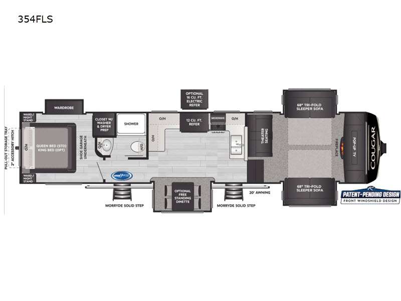 Man cave, TV room, family space, and/or extra bedroom are a few ways you can use the front living area with a pop-up TV that has a fireplace below. Everyone will have seating with two tri-fold sleeper sofa slides and two theater seats, and/or some might decide to play games at the legless dinette table or choose the free standing dinette option in the separate kitchen. The dual entries offer a smooth flow of traffic when the whole family is with you, and the spacious kitchen has lots of counter space, a pull-out pantry, and all the kitchen amenities needed to keep everyone fed. Access the full bathroom from the hallway to get cleaned up, and relax on your own queen bed in the rear bedroom whenever needed. You will find a closet prepped for a washer/dryer option, shoe garage underneath the bed, and three wardrobes for plenty of clothing storage.