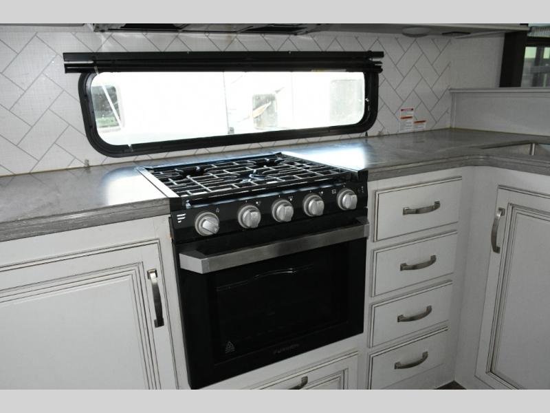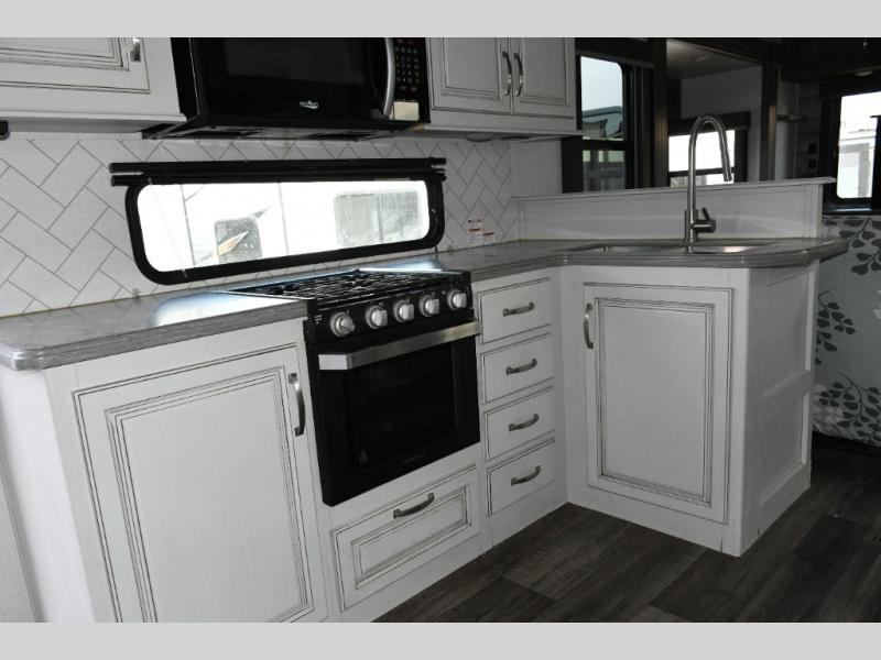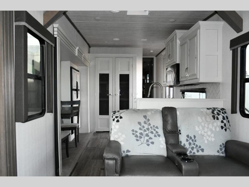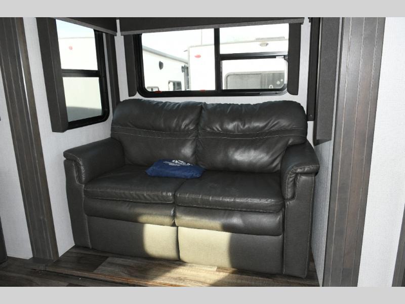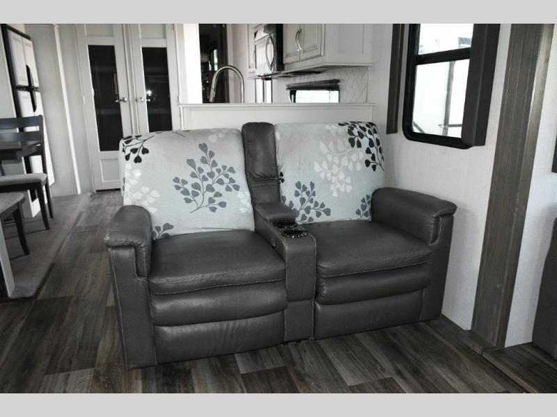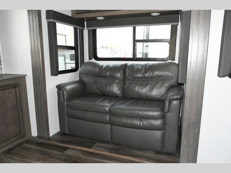 Imagine stepping into your own private living room after a day exploring state parks or settling into a long-term destination. With opposing slides, dual tri-fold sofas, and theater seating facing a large entertainment center, this is a fifth wheel built for comfort-driven travel.