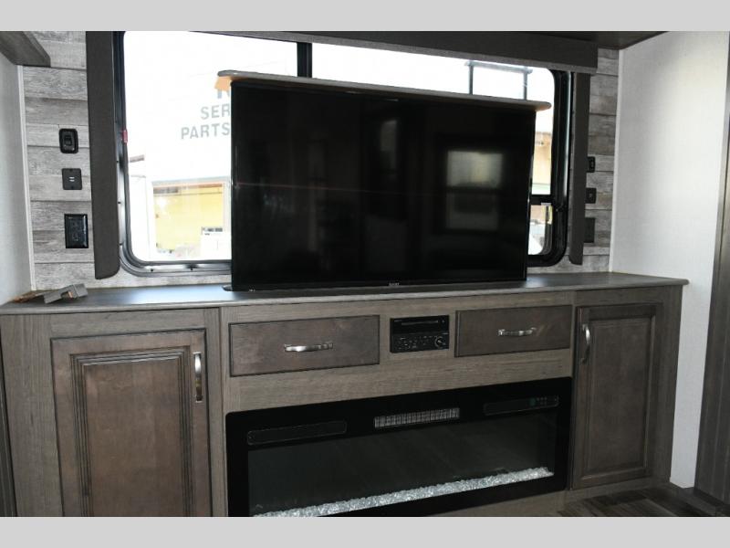 The rear den is the heart of this 366RDS. Whether hosting grandkids for the weekend or enjoying a quiet movie night, the dual tri-fold sofas expand sleeping capacity while maintaining a cozy residential feel. The fireplace adds warmth and ambiance, turning chilly evenings into comfortable retreats.