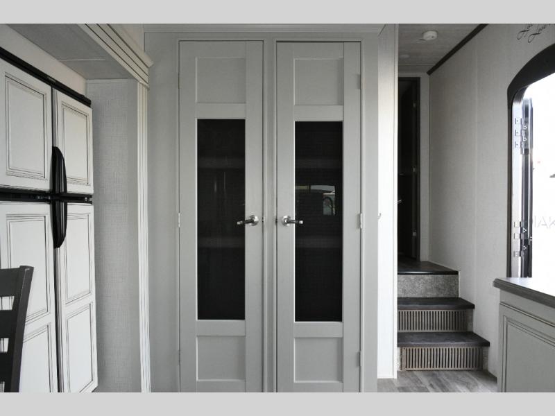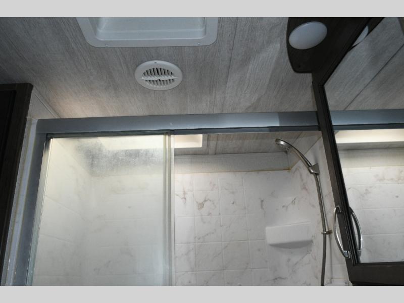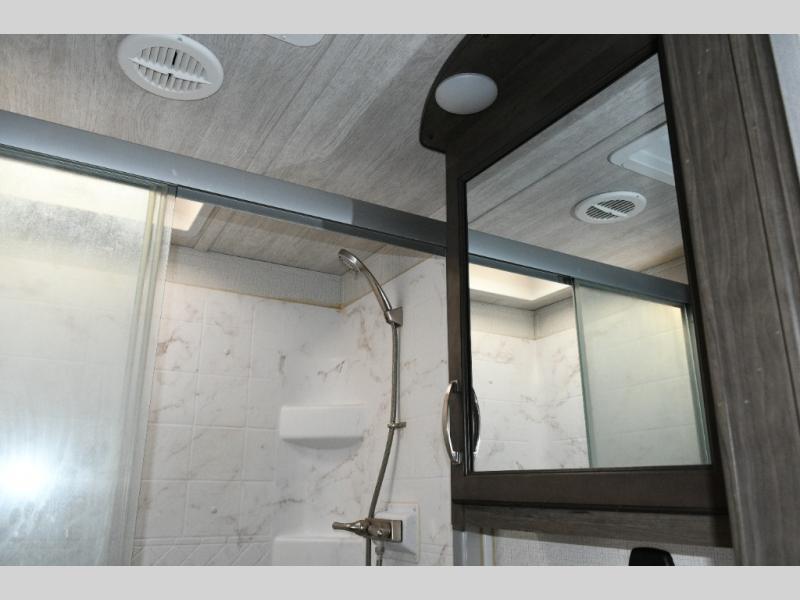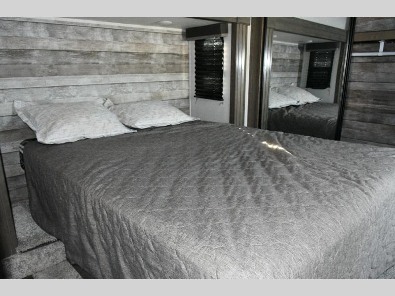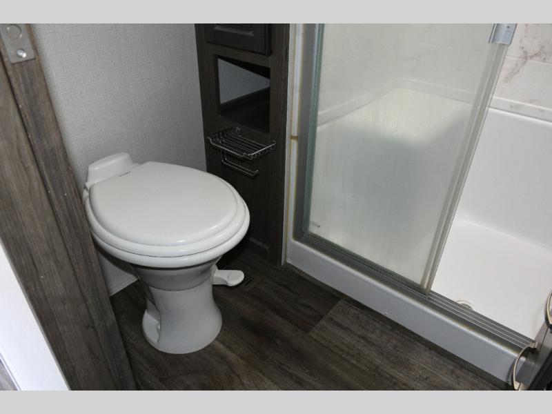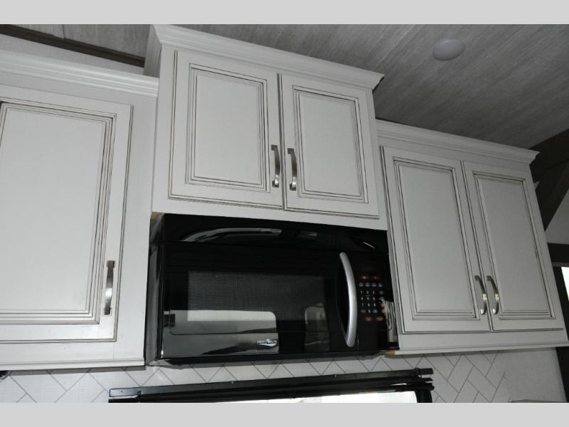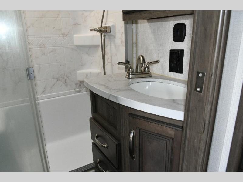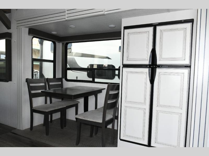 The separate kitchen ensures the cook stays connected without feeling crowded. A large pantry provides storage for extended trips, and the generous refrigerator options allow you to stock up for weeks at a time. The choice between booth or free-standing dinette gives flexibility based on your preferred dining style.
