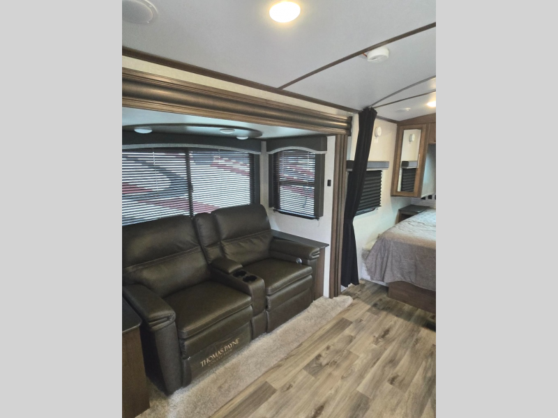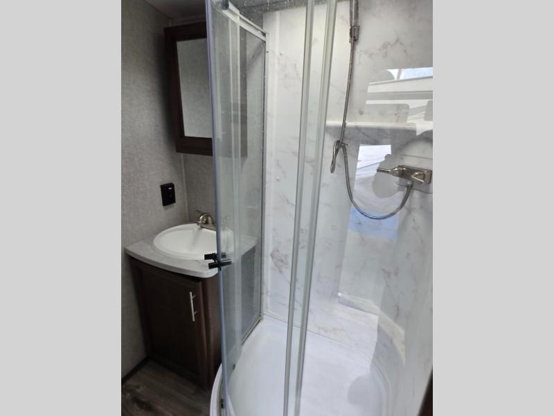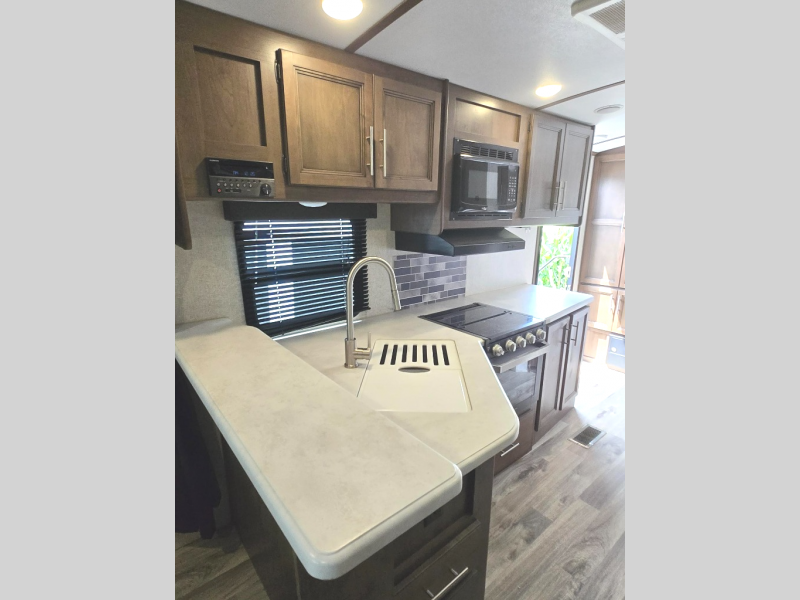 Imagine waking up from your own king bed to enjoy a hike, a bike ride, or a relaxing time outside under the 16' power awning while you wait for your spouse to wake up. With this Cougar Half-Ton travel trailer, you can make breakfast inside with full amenities. You will be able to get cleaned up in the full bathroom without having to wait your turn for the public facilities. Plus, there is a privacy curtain for the bedroom so that you have an additional place to get ready, and the bar top gives you extra room to sit down with a hot meal.