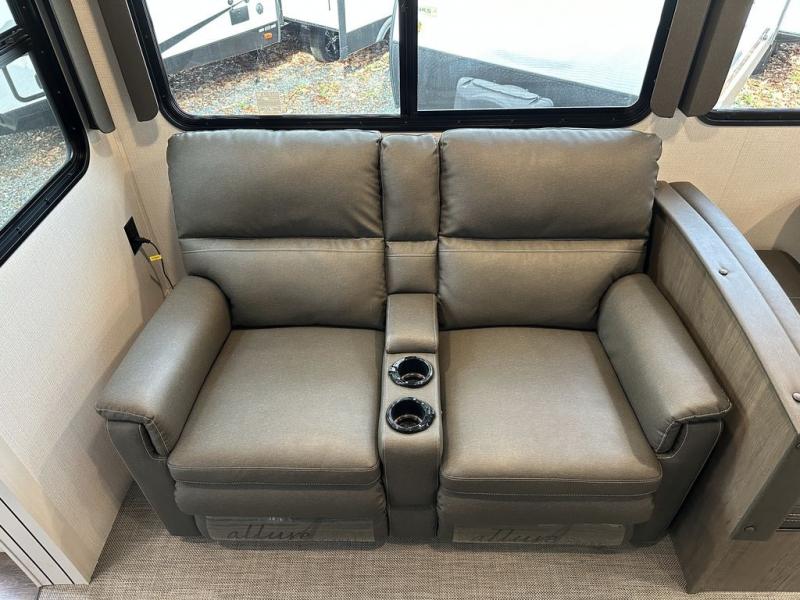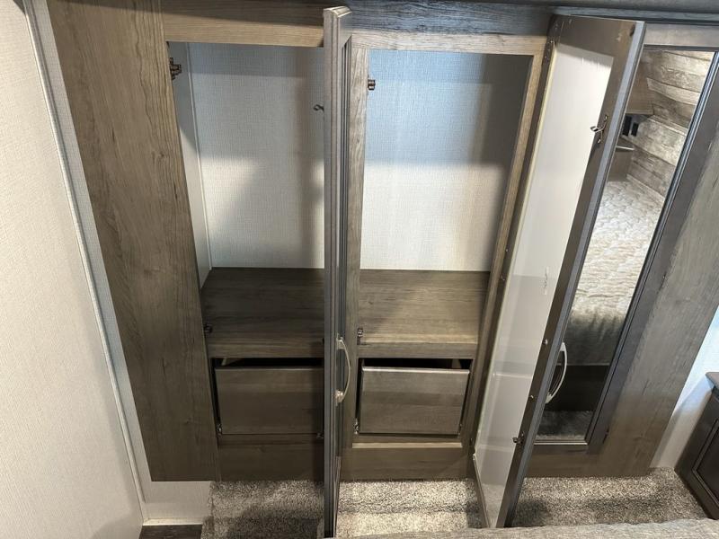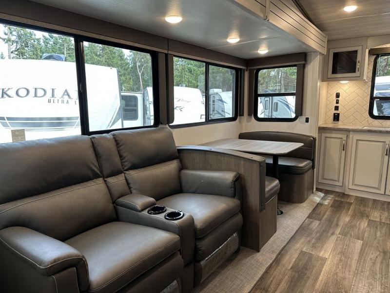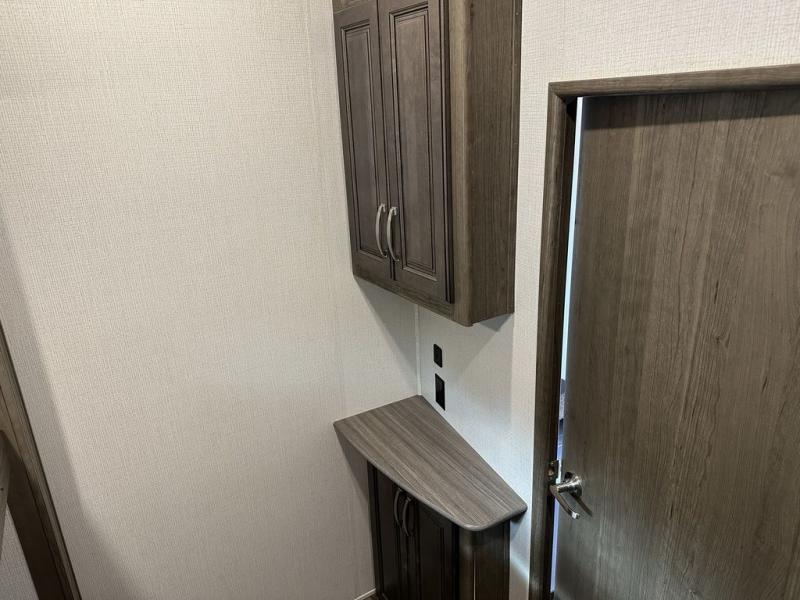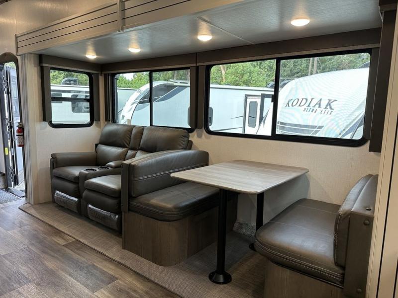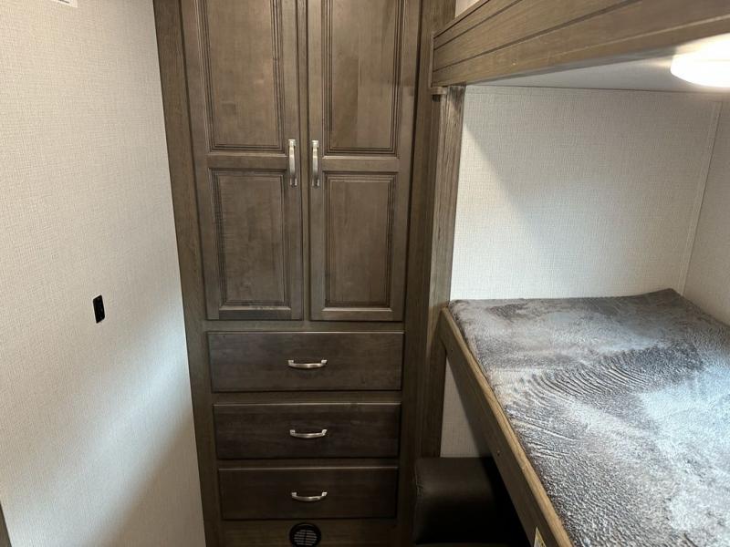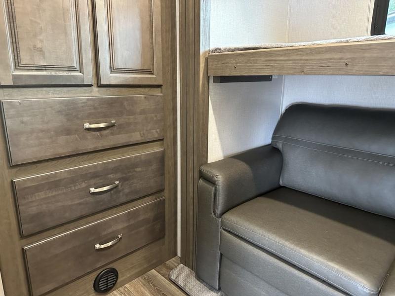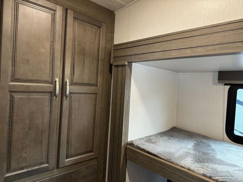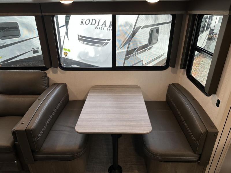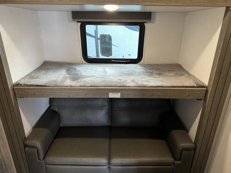 You'll have a new way to vacation once you get this Cougar Half-Ton fifth wheel in the driveway! Because this unit has two bedrooms, you'll be able to sleep separately and comfortably each night. The front private bedroom has a wardrobe slide so that you can store your garments, and the private bunkhouse has a slide out with a flip bunk above a sofa. Plus, there is also a desk top so that you can sit down and get some work done whenever you need.