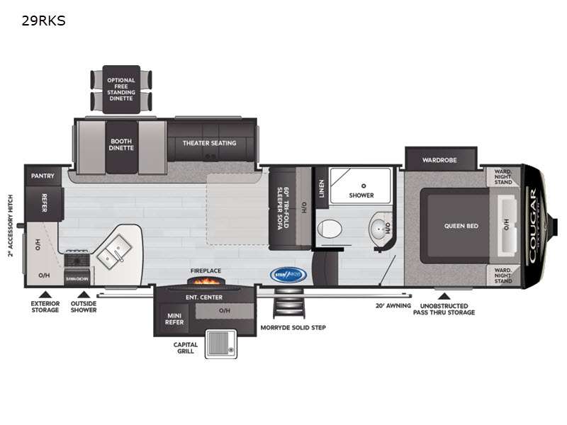 You'll have all that you need to enjoy every adventure with this Cougar Half-Ton fifth wheel! A 60" tri-fold sleeper sofa, theater seating, and a booth dinette give you comfortable accommodations to offer to any friends that stop by, and you'll be able to offer them more than just a place to sit because the 21" Furrion range and microwave will allow you to prepare sweet treats for those guests. If you all head out to look at the stars, you can grab some extra lawn chairs from the exterior pass-through storage compartment.