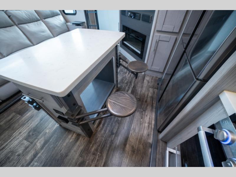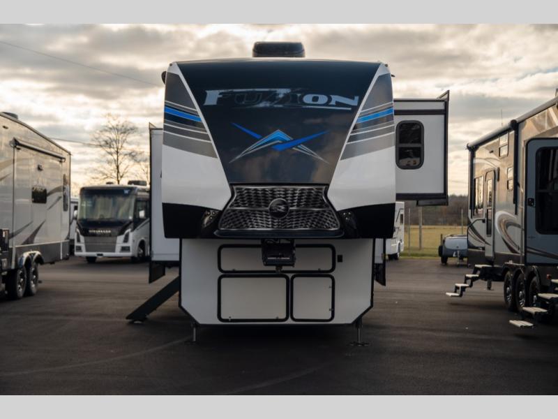 Seek new thrills and see new sights in a Fuzion toy hauler fifth wheel by Keystone. A few of the advantages you'll find with these models are Adjust-A-Track frame-welded tie-downs, Tru-fit slide construction, 12V color-coded wiring, plus much more. The Max Turn technology makes turning and parking easier than ever, and the MORryde CRE 3000 suspension will provide smooth towing to the campground. You will stay comfortable year around with the in-floor heating ducts and the Blade high performance air flow system that gives 20% more air flow. Each model includes many interior comforts, including residential-style furniture, extra tall ceilings with crown molding, and fiberglass backed linoleum floors. The garage features gas and oil resistant tuff-fly flooring, an 8' ramp door, a fuel station with dual 30 gallon tanks, and double electric beds with dual opposing sofas so you can invite more friends along!