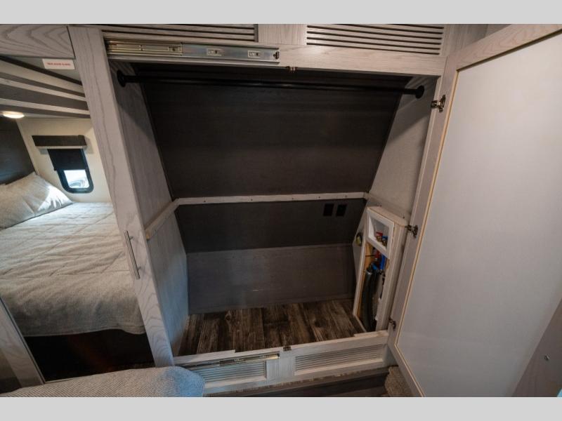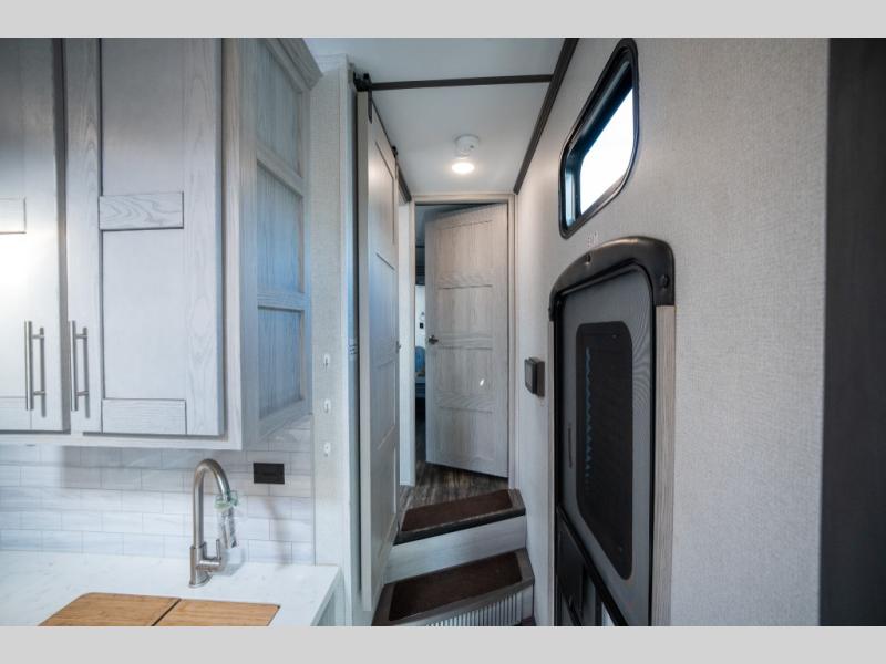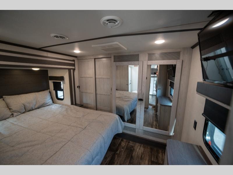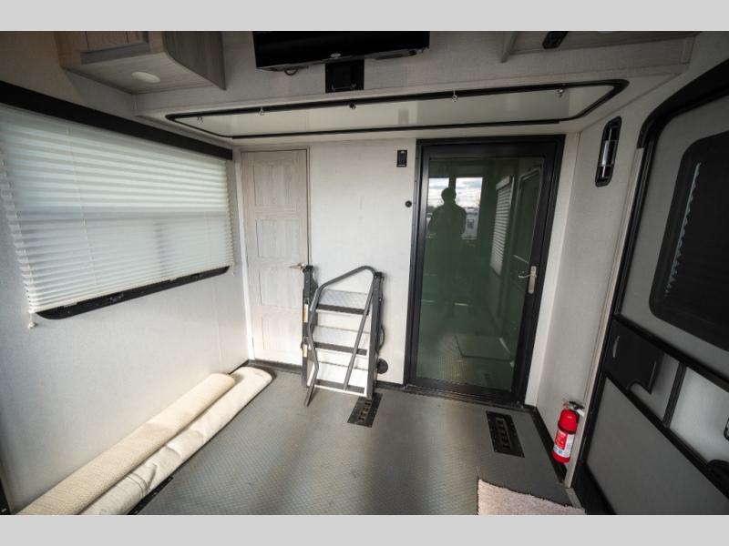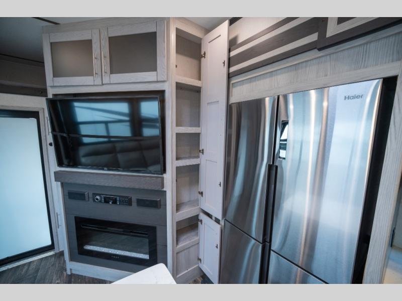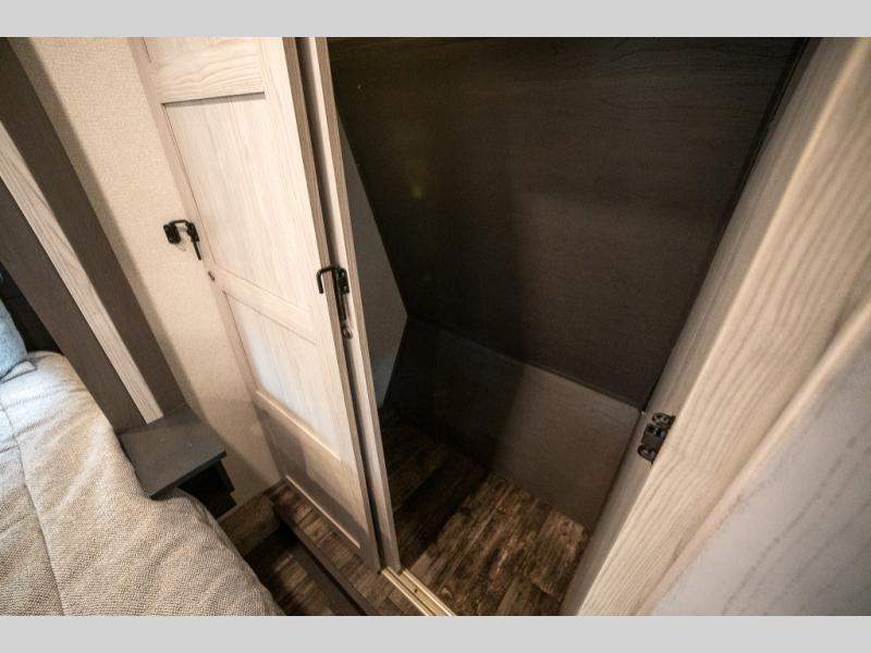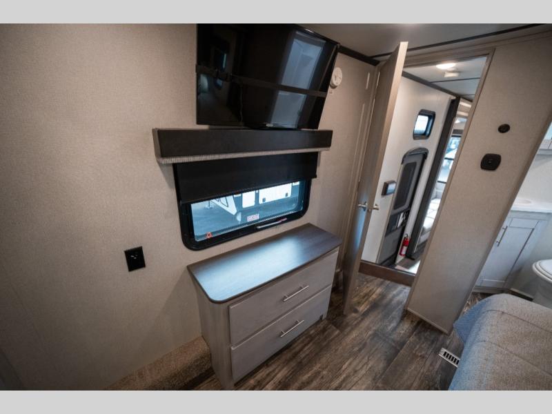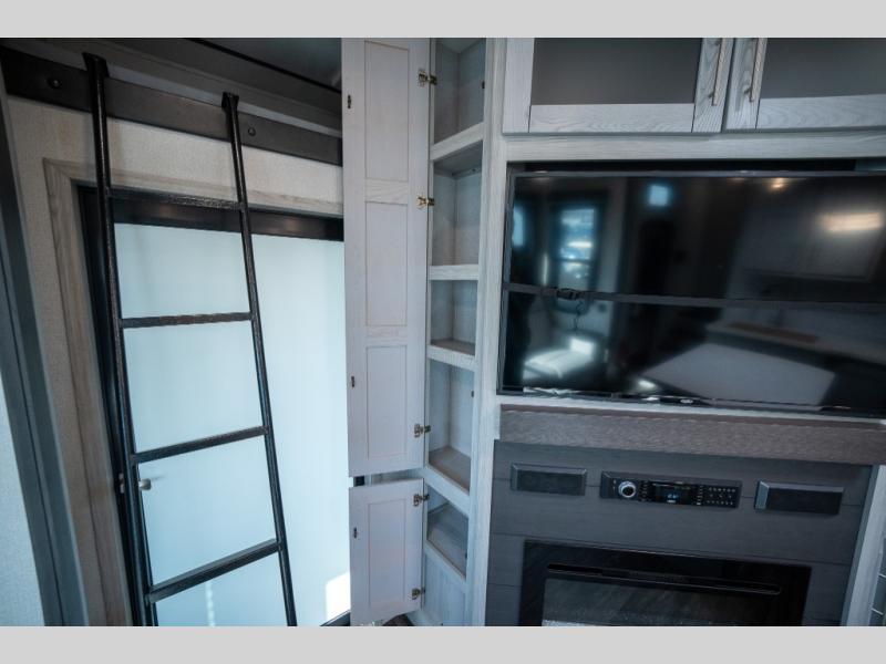 Enjoy open living spaces and convenient features in this spacious toy hauler. The 11' separate garage includes its own exterior entrance door, a loft with a bunk mat, plus a half bath for guests. You can comfortably sleep eight people with the added dual opposing sofas and a top queen bed, and you'll find three LED TV's throughout for your entertainment. The main living area includes a table with swing out stools the kids will love, and the two pantries can hold all the dry goods and snacks. The dual entry full bath will create a front master suite that will feel just like home. Here, you'll enjoy your own LED TV, a dresser and a master closet, plus a space to add an optional washer and dryer if you choose!