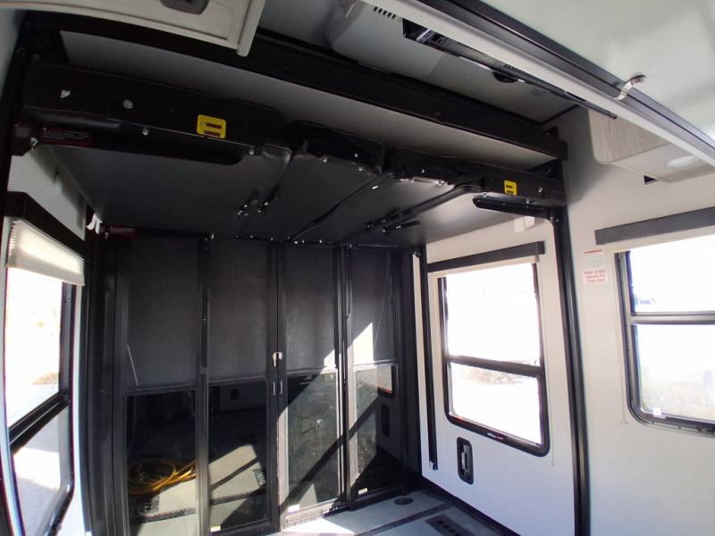 Bring your toys, your friends, and your sense of adventure in the Fuzion 373, a fifth wheel toy hauler that blends luxury with practicality. With double entry doors and an 11' separate garage, everyone has their own space to relax and recharge. The garage even features a half bath and loft with bunk mat, plus dual opposing sofas and a top queen bed, so there’s room for up to eight people to sleep comfortably.