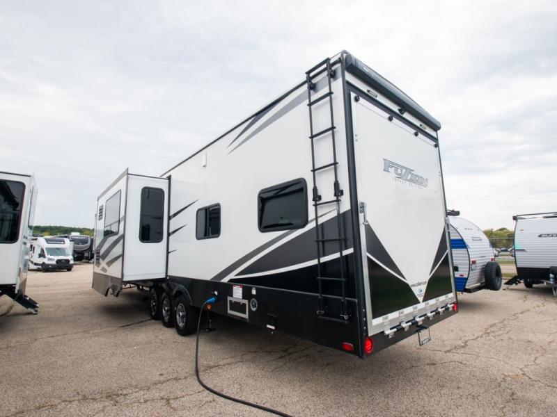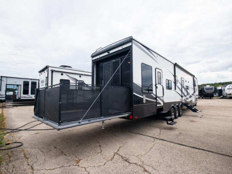This Fuzion Impact Edition toy hauler is similar to model 359, but you will enjoy a larger 15' separate garage for your favorite riding toys on this unit. Your guests can sleep on the electric queen bed with dual opposing sofas underneath, and there is a loft with a bunk mat for the kids. Within the main living area you will find a unique U-shaped kitchen countertop with swing-out bar stools, a large slide out with a sofa and 12-cu. ft. refrigerator, plus an LED TV and fireplace for a more at-home feel. The full and half bath will make camping with friends and family easier than ever, and you will appreciate the outdoor TV prep if you choose to bring along your own TV for entertainment!