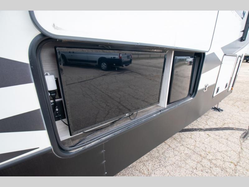 Keystone specifically keeps you, the customer, in mind as they construct and build each Fuzion Impact Edition toy hauler. The 100" wide body and 5k interlock system with frame-welded tie-downs ensure convenient and secure shipment of your favorite ride-on toys. You will appreciate the Keystone Exclusives, such as the Tru-fit slide construction, the in-floor heating ducts, 4G LTE and Wi-Fi prep, plus many more hassle-free features. Each model includes a 30-gal. fuel station with a 12V pump and a static line and the Omni-Chill A/C system, which is the highest-performing energy-efficient system available. Inside, you will love the hardwood cabinetry, pressed countertops in the kitchen, and large tinted safety-glass panoramic windows to let natural light in. These toy haulers also feature plenty of storage space for all your belongings, including under-bed storage and a lighted pass-through compartment!