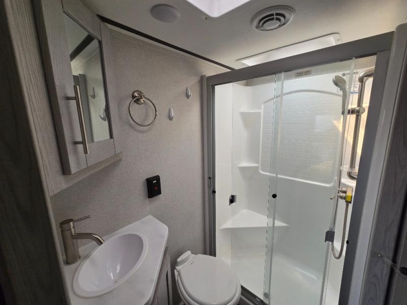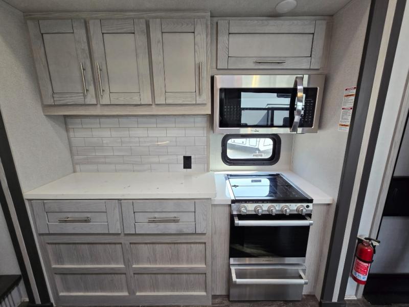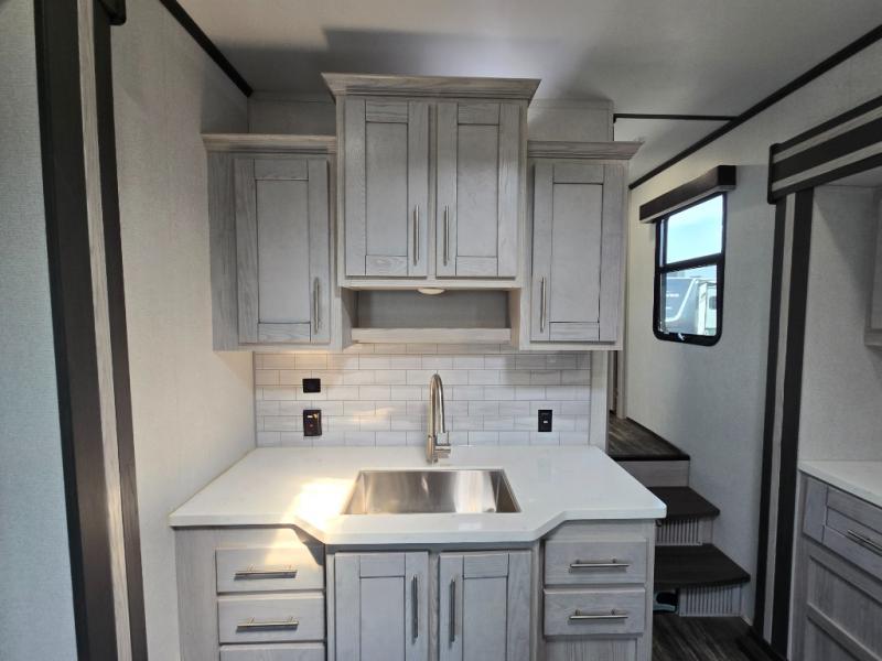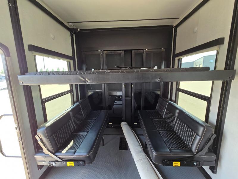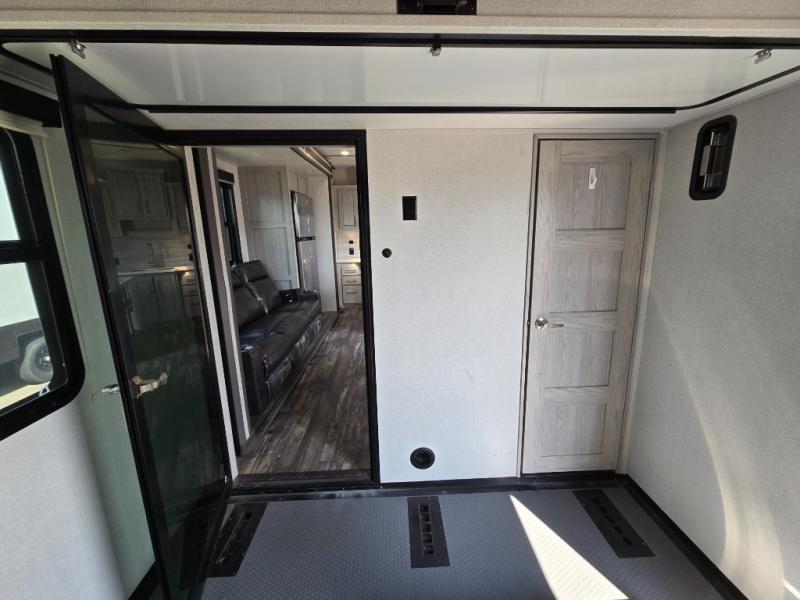 Load up your kayaks and your bikes and head to the lake in this toy hauler. The 13' separate garage includes its own half bath, an LED TV, plus a loft for little ones. head to the main living area to dine at the table with swing out stools, or you can sit outside under the two power awnings. There is also an exterior LED TV to entertain guests during the big game. Everyone can have their turn cleaning up in the full dual entry bath, and you and your spouse will appreciate your own master bedroom up front. Bring along all of your clothes with a master closet and a dresser, plus there is a space to add an optional washer and dryer!