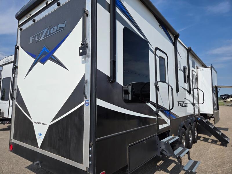 Seek new thrills and see new sights in a Fuzion toy hauler fifth wheel by Keystone. A few of the advantages you'll find with these models are Adjust-A-Track frame-welded tie-downs, Tru-fit slide construction, 12V color-coded wiring, plus much more. The Max Turn technology makes turning and parking easier than ever, and the MORryde CRE 3000 suspension will provide smooth towing to the campground. You will stay comfortable year around with the in-floor heating ducts and the Blade high performance air flow system that gives 20% more air flow. Each model includes many interior comforts, including residential-style furniture, extra tall ceilings with crown molding, and fiberglass backed linoleum floors. The garage features gas and oil resistant tuff-fly flooring, an 8' ramp door, a fuel station with dual 30 gallon tanks, and double electric beds with dual opposing sofas so you can invite more friends along!