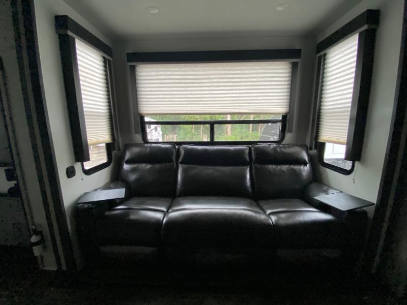 Step inside this Fuzion Impact Edition fifth wheel toy hauler for a fun trail-riding weekend. You can easily unload your toys from the 13' separate garage using the 8' garage door. Once the toys are unloaded, relax on the dual opposing sofas, or take a rest on the electric queen bed. The kids or guests can climb up into the loft that includes a bunk mat, and there is a half bath in the garage for added convenience. This model includes a peninsula countertop with plenty of space to prep meals and clean up, and there is a 12-cu. ft. refrigerator for perishables. You'll find a residential shower with a seat in the dual-entry bath, and the front bedroom will feel just like home with its residential queen bed and wardrobe slide for all your clothes.