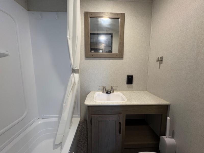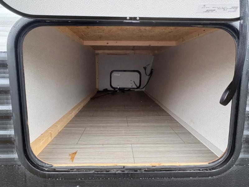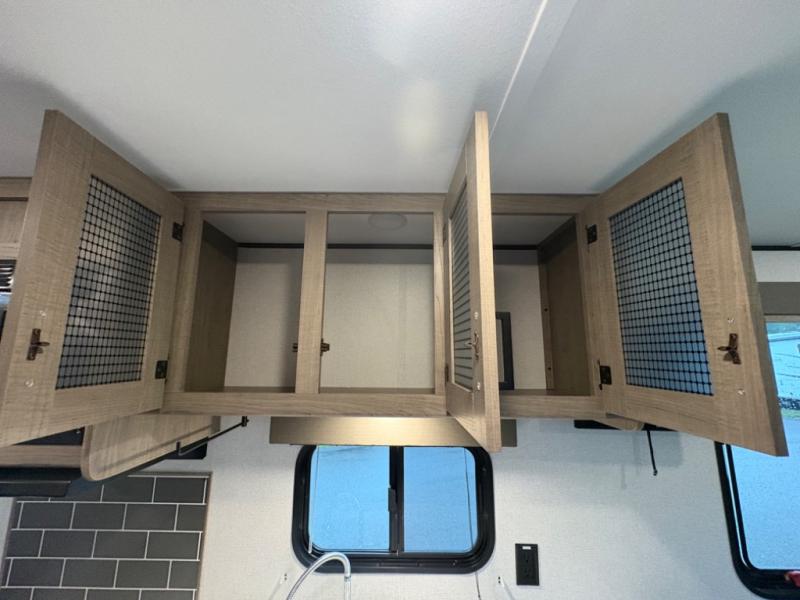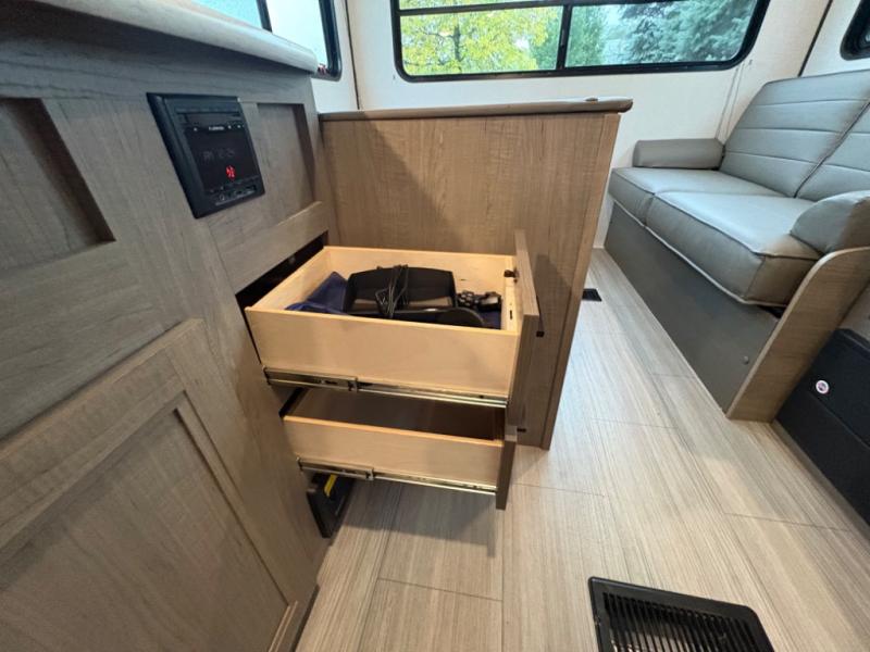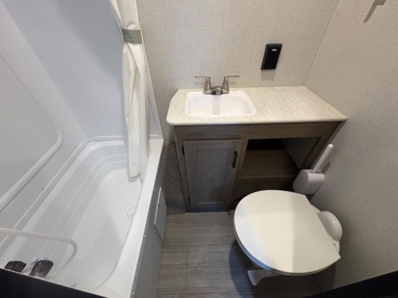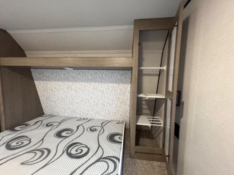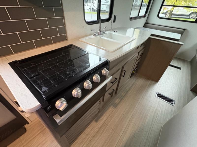 Your family of five will enjoy camping in this Hideout travel trailer as you tour the countryside or take a weekend getaway. The front bedroom area has two closets and overhead cabinets that provide plenty of storage solutions for your extra garments and toiletries, and the queen-size bed delivers complete relaxation throughout the night. You will find it easy to get ready for the day with all of the amenities in the full bathroom, and you will love being able to toss your dirty clothes into the hidden laundry chute.