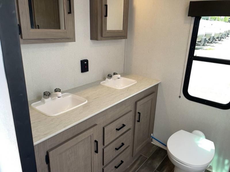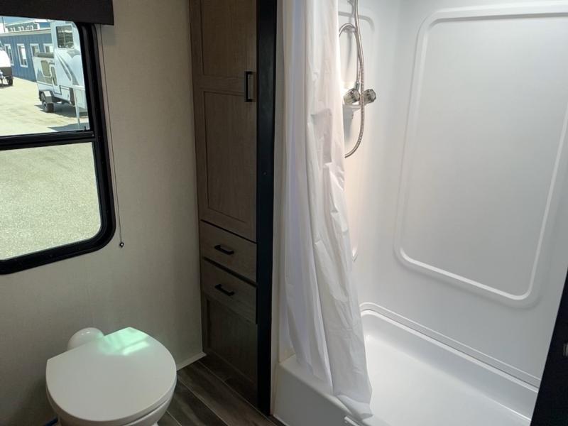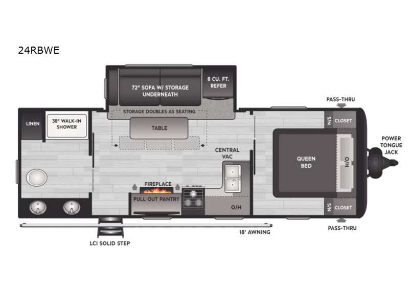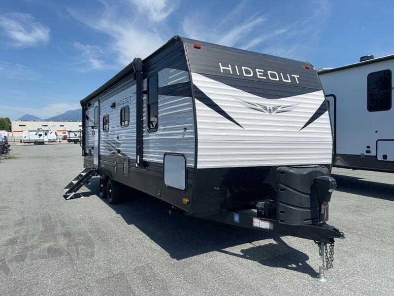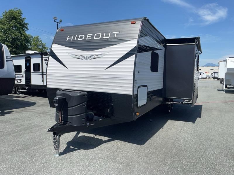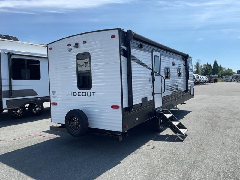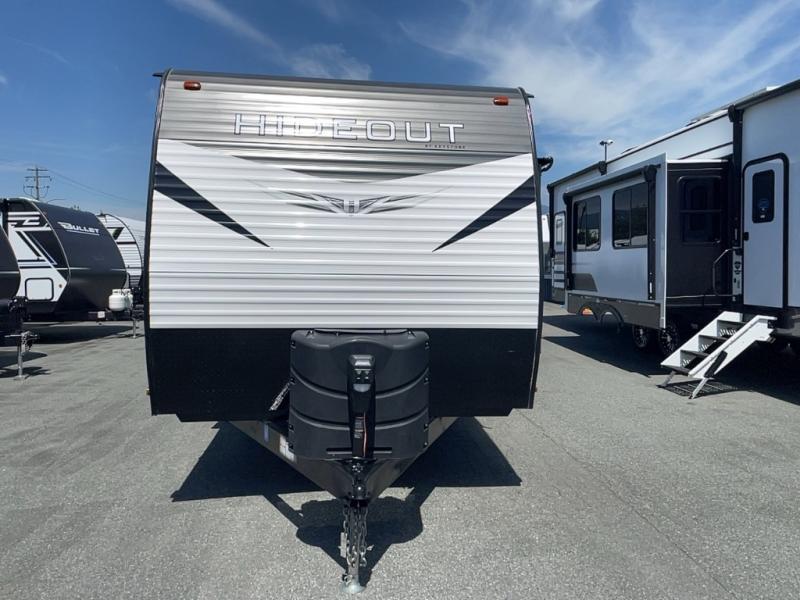 You and your spouse are going to love each trip you take with this Hideout travel trailer! From the walk-around queen bed, dual closets, and nightstands in the private bedroom to the spacious rear bathroom with dual sinks, a 38" walk-in shower, and linen storage, you are going to be impressed. Both of these rooms have space-saving sliding doors as well. The sofa is exceptionally useful because it has storage underneath that can also be used as seating on the other side of the table. The chef will love the L-shaped kitchen with everything needed to make warm meals, plus a pull-out pantry for storage and a central vacuum to keep everything tidy. The 18' power awning offers another living area when you want to enjoy the outdoors, and the pass-through storage allows you to stow your camping chairs, charcoal and such.