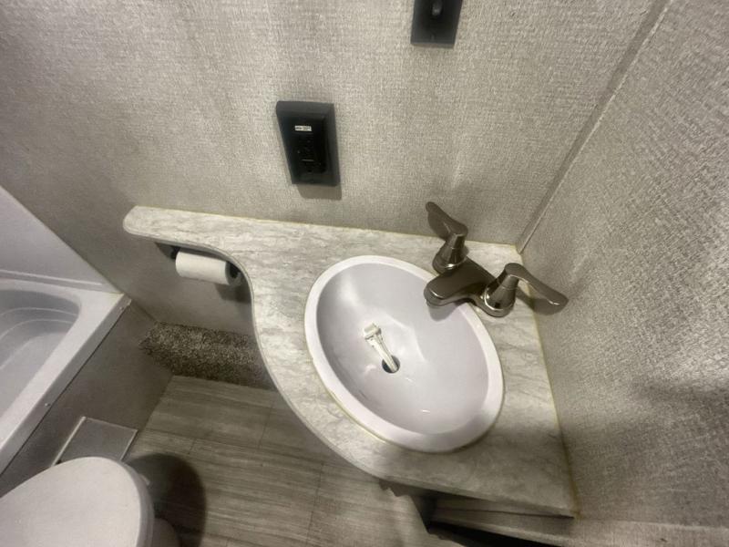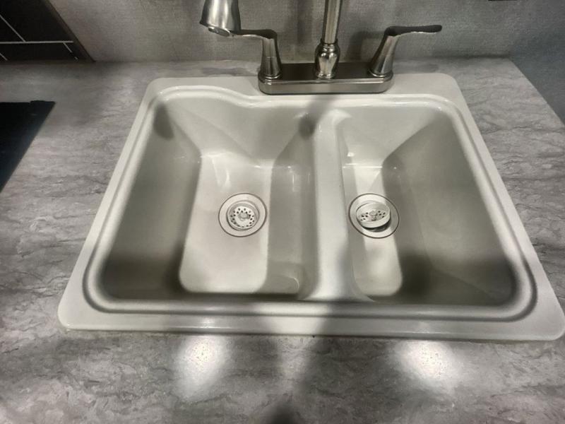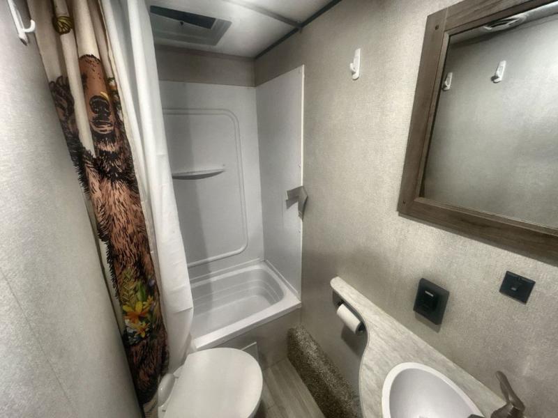With sleeping for nine, this Keystone Hideout is the perfect travel trailer for a larger family to enjoy. This model offers a full bathroom where you can easily and privately get ready for the day. Sleeping space for everyone can be found with the set of double-size bunks, a queen-size bed in the private bedroom, a booth dinette, and a sofa. Throughout this model you will find shelf space, as well as overhead cabinets for all of your extra camping items, and the two bedroom closets will come in handy for holding onto those extra sweaters and hiking boots. In the evening if the weather is nice, you will want to sit out under the lighted adjustable power awning and enjoy the scenic sunset together!