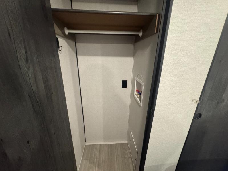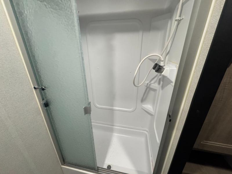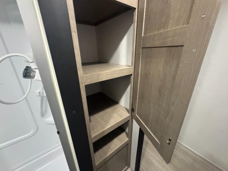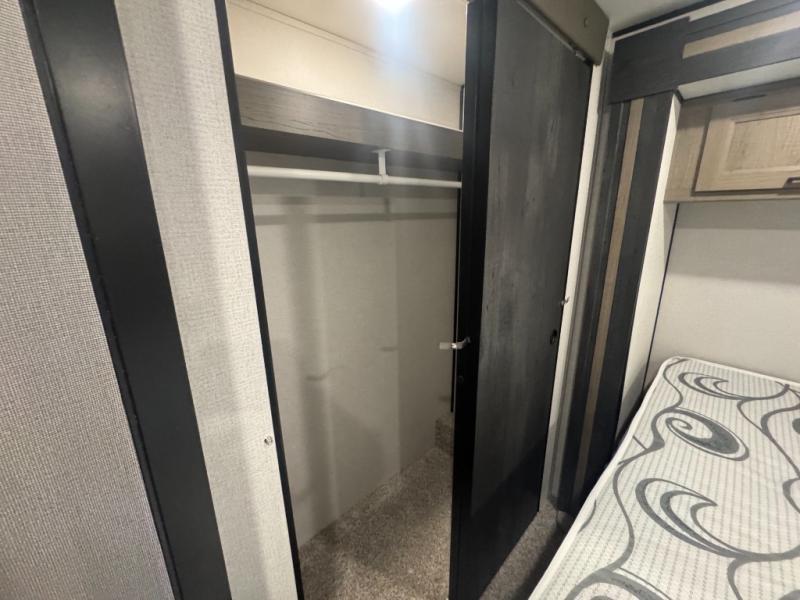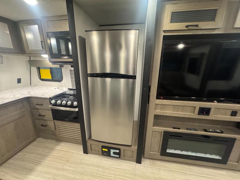 This Hideout destination trailer will be the best cozy hideout in the woods! With its front kitchen, you have extra countertop space so that you can freely work on dinner each night, and the central vacuum that is located nearby will allow you to clean up any stray crumbs that may have fallen while you were cooking. There is a hidden pantry behind the swivel entertainment center so that you can store your canned goods, and the patio door will be a great addition because it will allow the sunshine to come streaming through while you are sitting down watching the 50" HDTV.