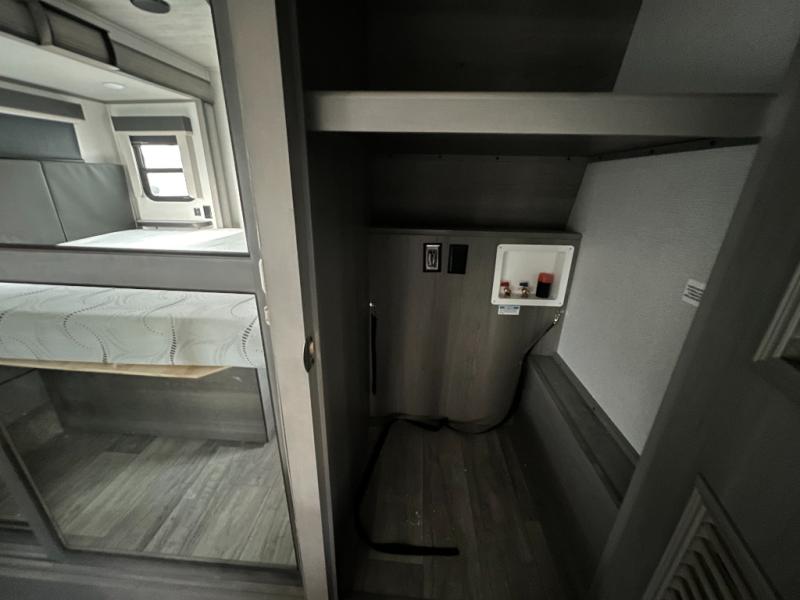 With this Montana fifth wheel, you can have adventures any time! The private bedroom has a barn door that closes it off from the rest of the unit, and the bedroom is fully equipped for comfort with a queen bed slide, a dresser with 32" LED HDTV, a clothing hamper, a huge closet, and an area prepped for the optional washer/dryer. The main living area is also going to feel exceptionally comfortable with its hide-a-bed sofa, power theater seating, fireplace, and 50" LED HDTV. As you spend your afternoon working on dinner, you'll appreciate that the large island provides you with additional prep space, and the coffee station is going to be a fun feature to use both in the morning and in the afternoon for a pick-me-up.