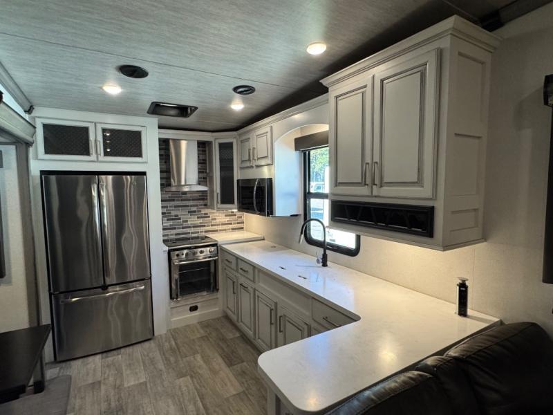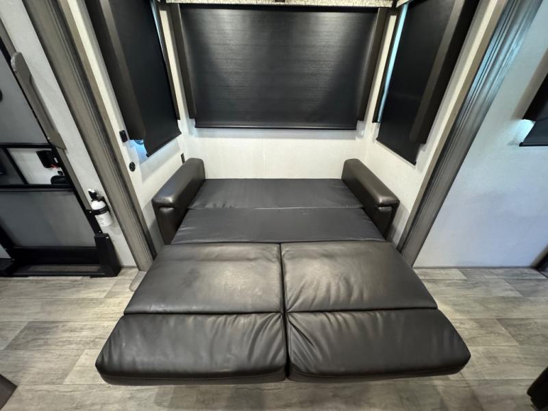 Just imagine you and your spouse and maybe your children camping at a state park or local RV spot in this Montana fifth wheel. Everyone will enjoy the floor space throughout provided by four slides. The rear kitchen layout offers plenty of counter space and all the appliances necessary to make meals the whole trip including an 18 cu. ft. residential refrigerator and convection microwave. Now imagine yourself relaxing on one of the two opposing hide-a-bed sofas after hiking, biking, or fishing earlier that day. There is a 50" HDTV, a fireplace, and power theatre seating. It's time to stop dreaming about your next get-a-way trip, and start living it.