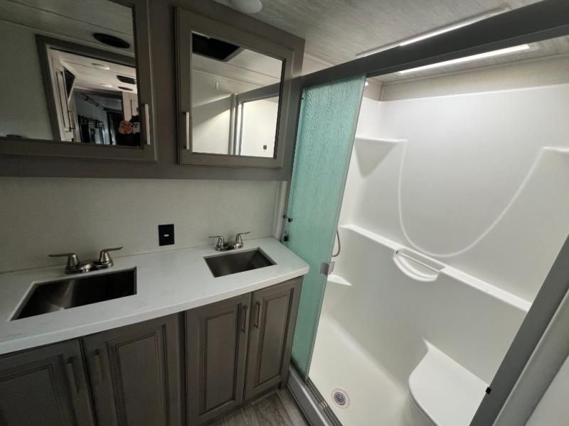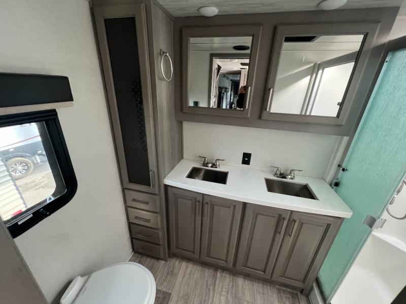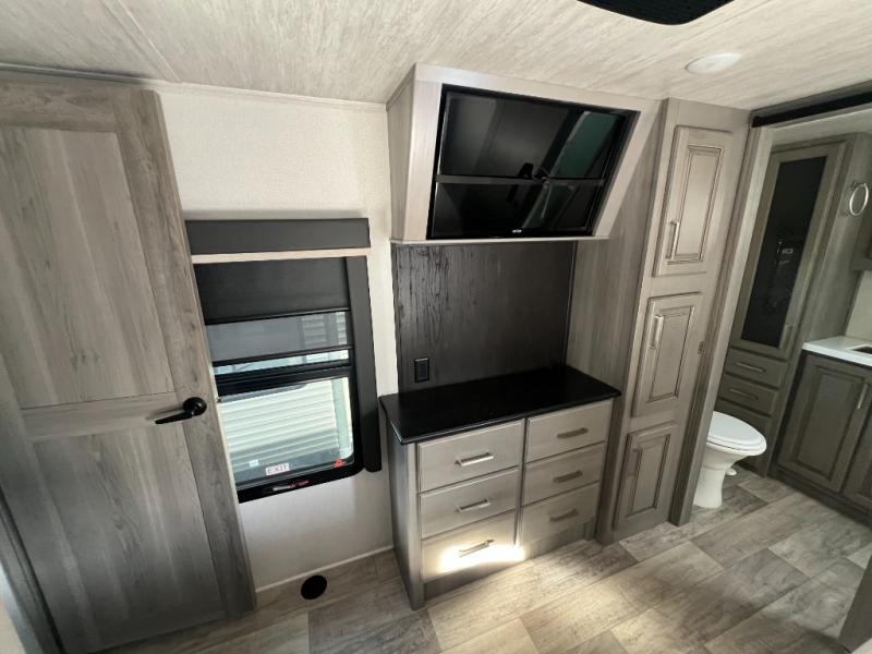 You and your family will feel the most at home when you are staying in this Montana fifth wheel because it has all of your favorite features from home, like a separate living room up front, a master suite with its own full bathroom, another half bathroom out in the kitchen, and an island in the kitchen for prep work. The other aspect of this unit that you will love is all of the comfortable seating with the two hide-a-bed sofas and power theater seating in the living room. There is also a fireplace and 50" LED HDTV in the living room to finish it off, and you will even find a second LED HDTV back within the master suite.
