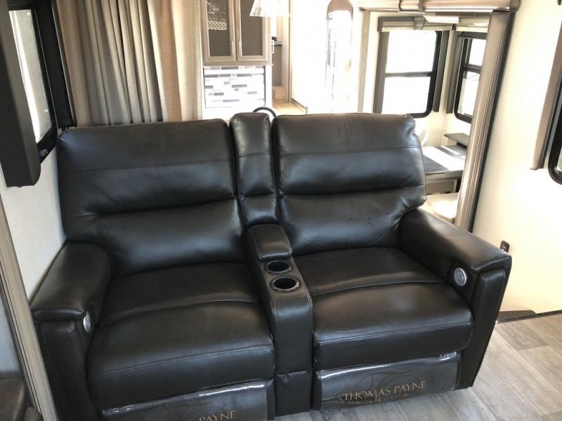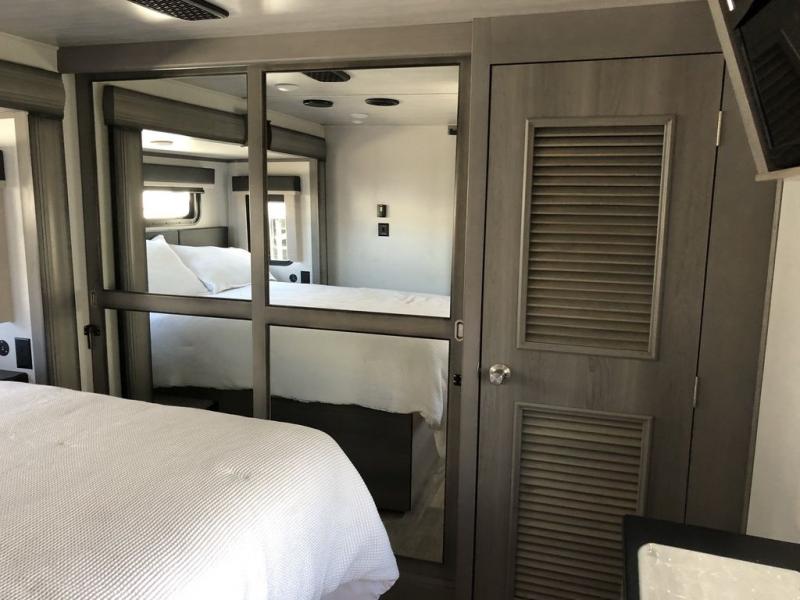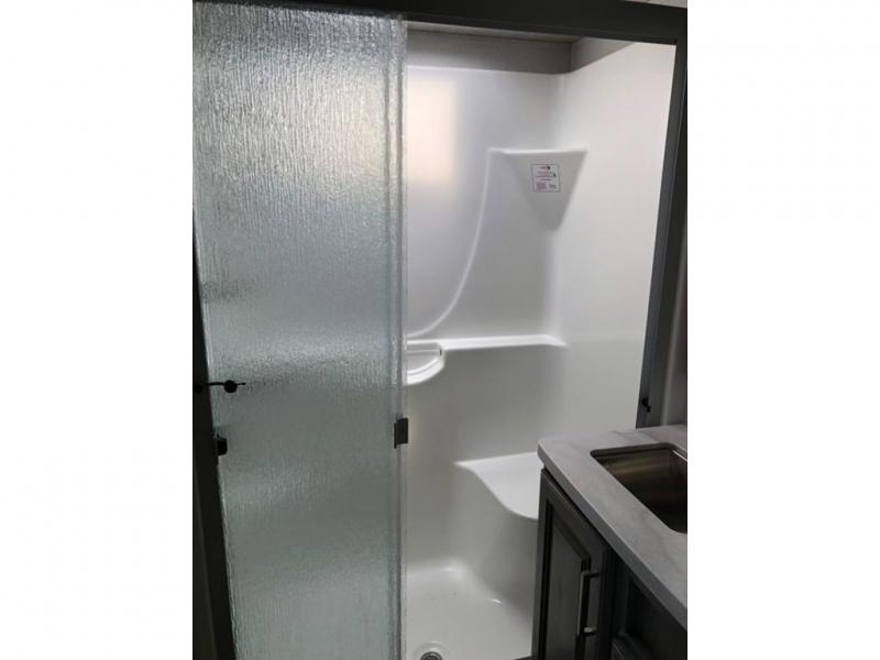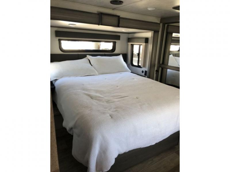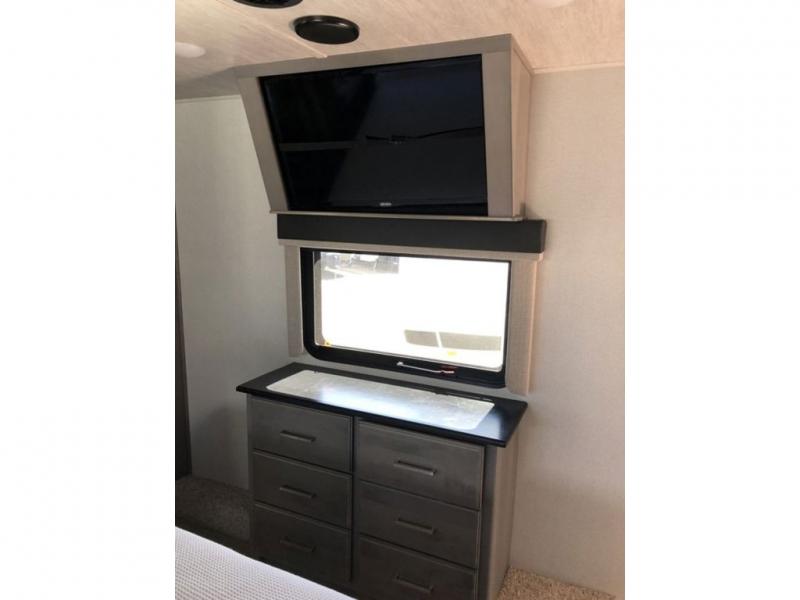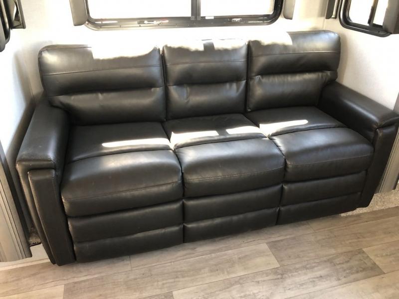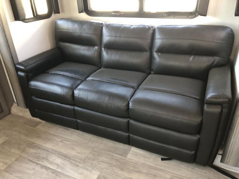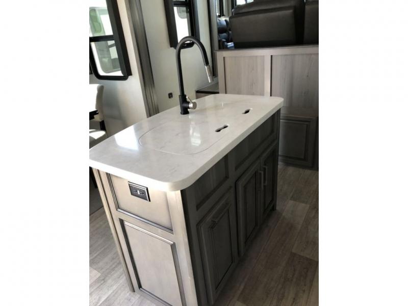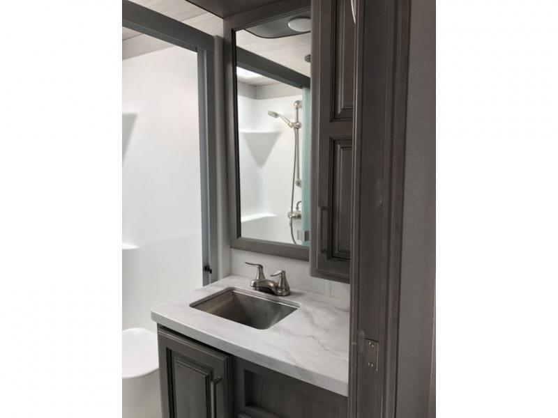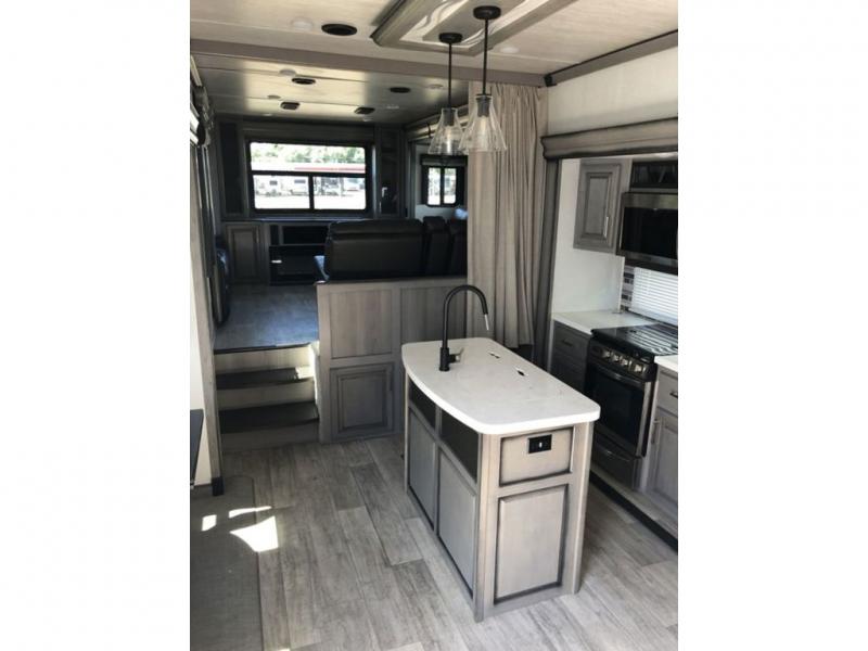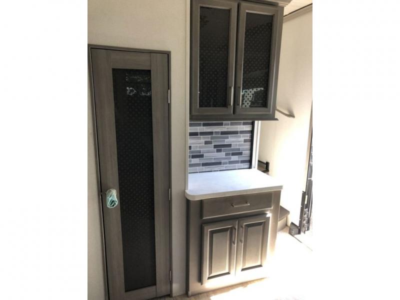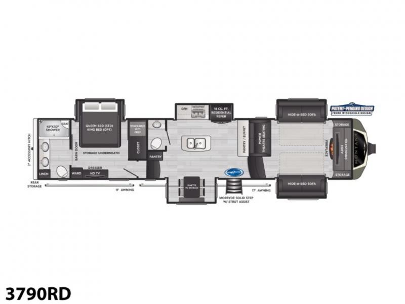 The thing that you will love most about this Montana fifth wheel is the kitchen! Because the kitchen has opposing slides, you have plenty of space to work around the island. There is also a coffee station that you can use whenever you need a specialty brew, and the pantry, floor cabinets, and overhead cabinets provide you with great storage. Right next to the kitchen is the separate living room which also has opposing slides so that you have room to lounge on the two hide-a-bed sofas or on the power theater seating, and if you need some privacy while you relax, you can simply head up to the queen bed slide in the private bedroom. The bedroom is where you will find the clothing hamper, under-bed storage, preparations for the optional washer/dryer, and a barn door to close it off.