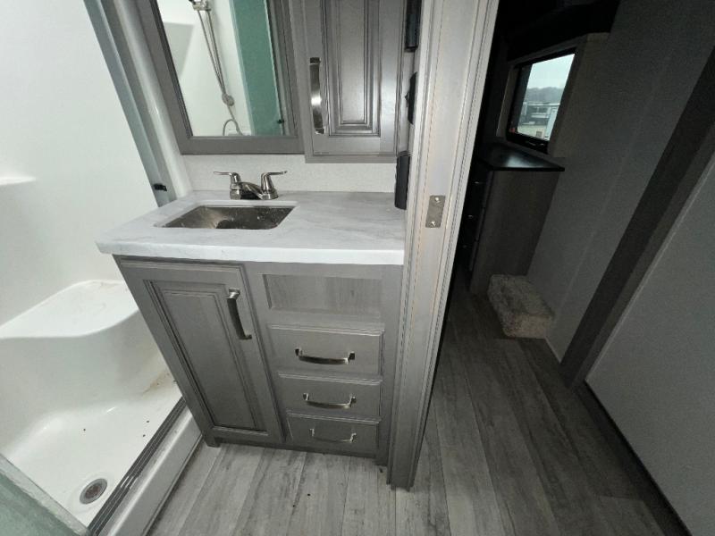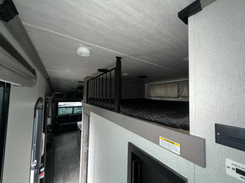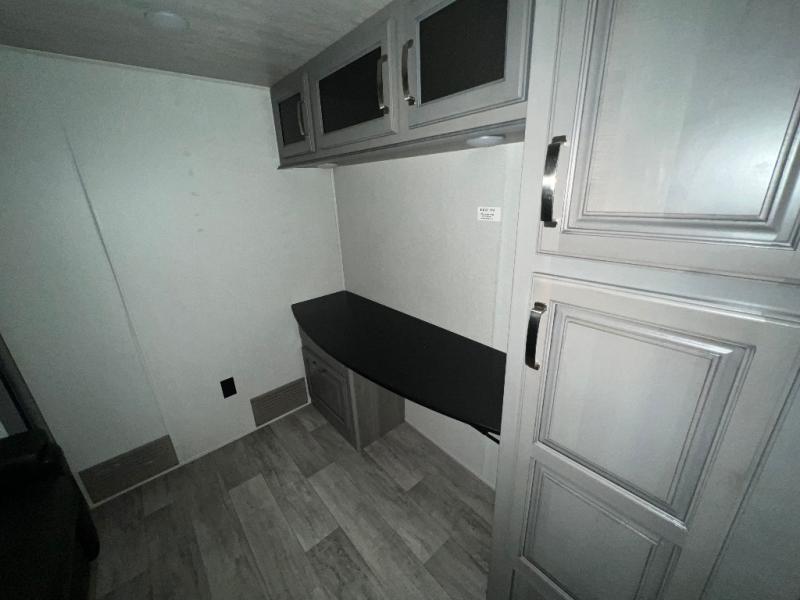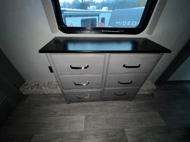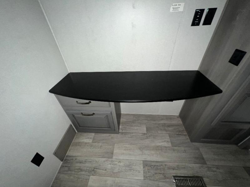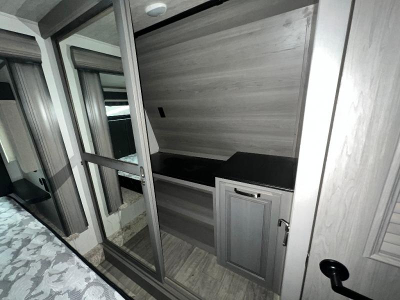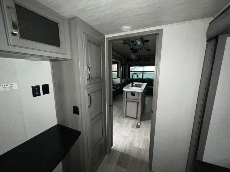 Whether it's a weekend at your local state park or a month-long journey across the country, you'll find great comfort in this Montana fifth wheel! The best feature on this unit is the bonus room because it can serve as a bedroom with its hide-a-bed sofa, or it can be used as an office since it contains a work desk. A set of barn doors closes this space off from the rest of the unit, and there is also a loft above where you can place storage bins or overnight guests. As you all gather together in the main living area, you'll appreciate the comfortable seating with the hide-a-bed sofa and power theater seating. You can also sit in one of the four chairs at the free-standing dinette. Up in the private bedroom, the clothing hamper will allow you to keep your floors free of dirty laundry, and the under-bed storage will allow you to keep your bulky sweaters and hiking boots hidden.