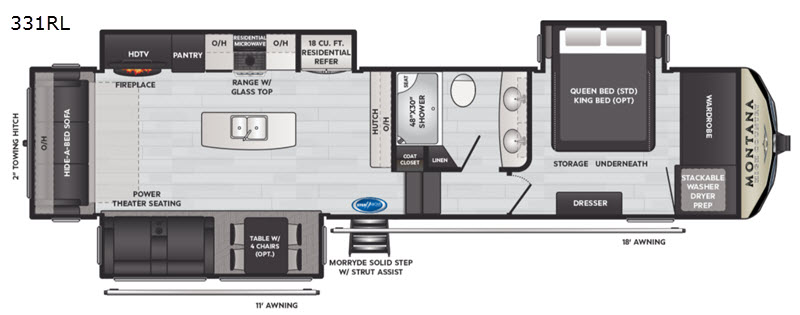 With each Montana High Country fifth wheel by Keystone you will enjoy family-friendly features, lightweight floorplans, and drop-frame construction for maximum storage. Each model is built for four season living with the heated and enclosed underbelly and the astrofoil insulated slide floors and underbelly. The Mystic Ash cabinetry, hardwood decorative slideout fascia, and accent crown molding create a luxurious fifth wheel everyone can get used to. These models include a Whisper Quiet A/C system to cool your space quietly and evenly, plus there is a 35,000 BTU furnace that will allow you to extend your camping season. The Montana High Country fifth wheels are equipped with a Road armor shock absorbing hitch pin for easy towing, and set-up will be a breeze with the Hitch Vision with LED lighting. There are many more features to love about these fifth wheels, like the MaxTurn front cap, the Solera series power awning(s), the residential appliances, and the list goes on!