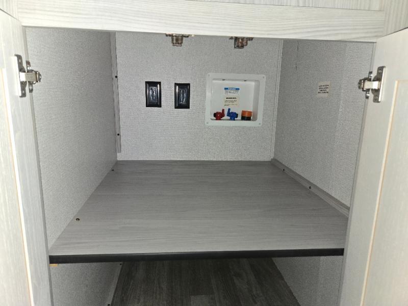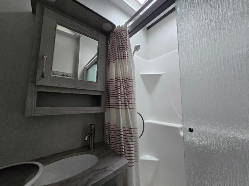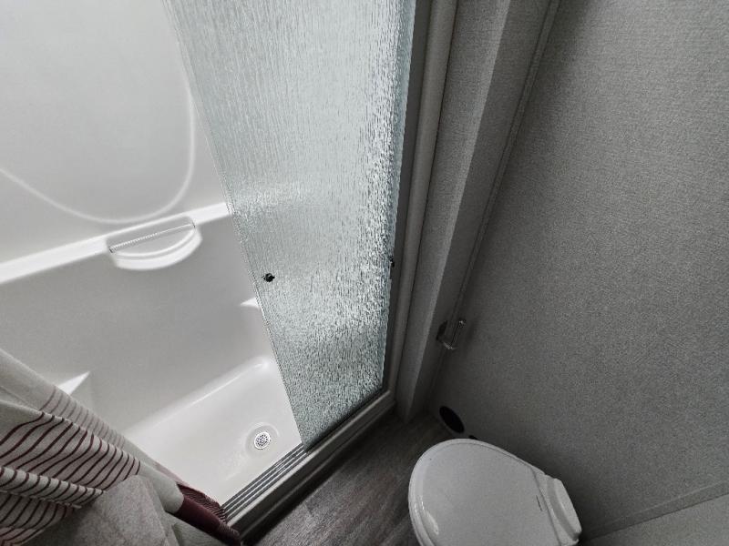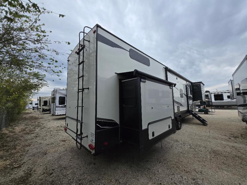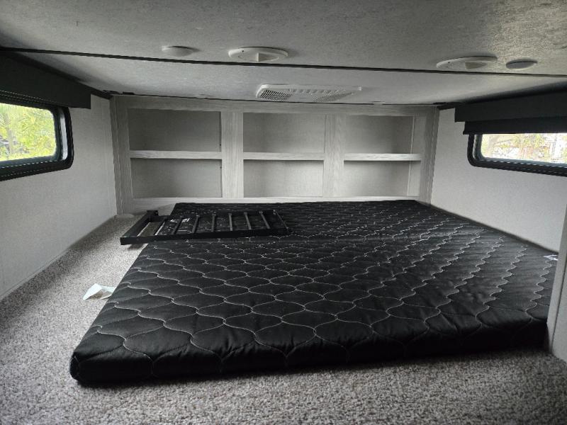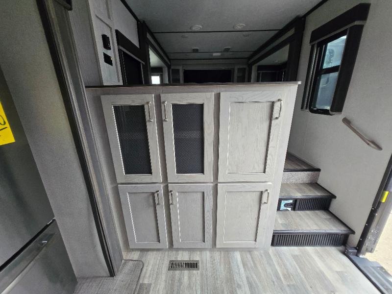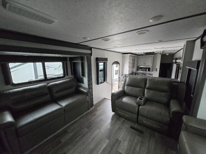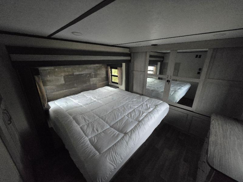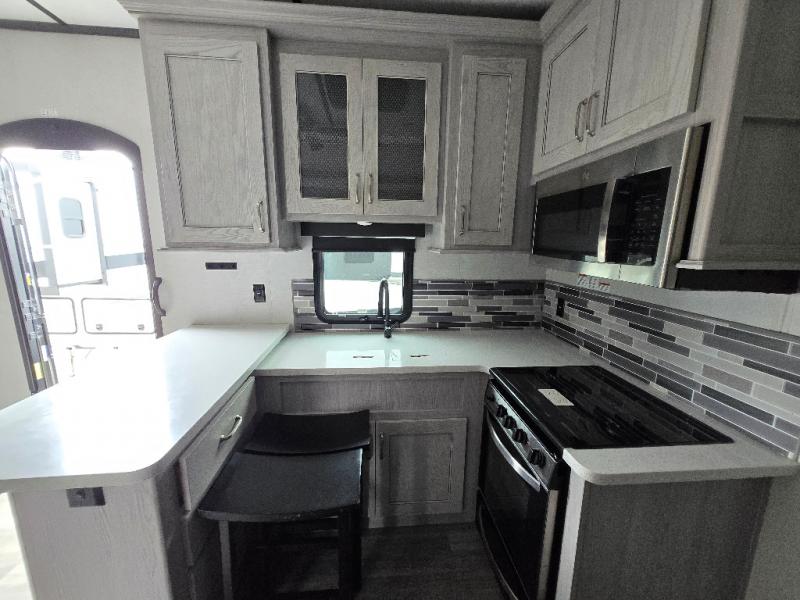 Your family will love this fifth wheel with a loft area over the rear master bedroom and the front living area which includes an entertainment center with a telescoping TV and a fireplace, a front windshield for great views, and dual opposing slides that open up the whole room for added comfort. Your guests can convert the two hide-a-bed sofas at night and you and your spouse will enjoy the rear private bedroom with a slide out queen bed. Let the chef of the family prepare breakfast on the three burner cooktop and the eggs and milk can go back in the residential refrigerator. This model also features unique dual entry doors on opposite sides of the unit for added convenience, and you might like to add a few options such as a washer/dryer and a free-standing table with chairs.