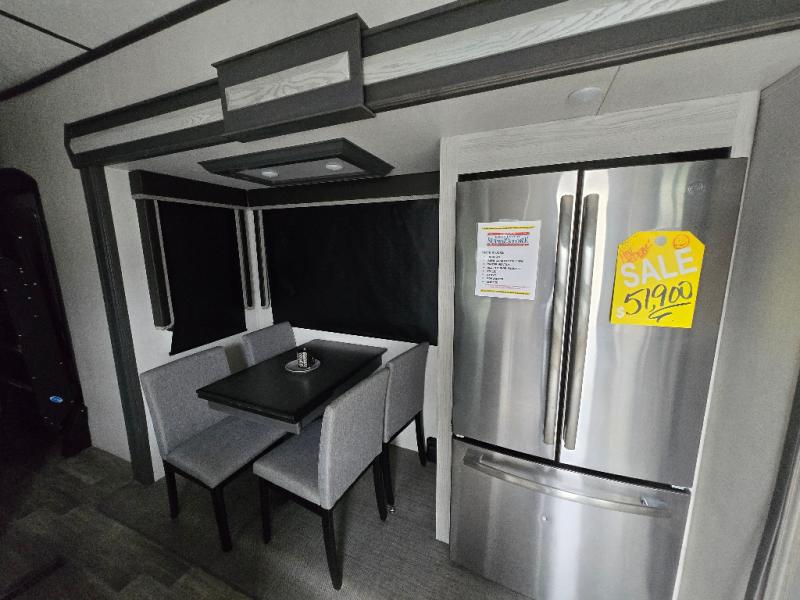 With each Montana High Country fifth wheel by Keystone you will enjoy family-friendly features, lightweight floorplans, and drop-frame construction for maximum storage. Each model is built for four season living with the heated and enclosed underbelly and the astrofoil insulated slide floors and underbelly. The Mystic Ash cabinetry, hardwood decorative slideout fascia, and accent crown molding create a luxurious fifth wheel everyone can get used to. These models include a Whisper Quiet A/C system to cool your space quietly and evenly, plus there is a 35,000 BTU furnace that will allow you to extend your camping season. The Montana High Country fifth wheels are equipped with a Road armor shock absorbing hitch pin for easy towing, and set-up will be a breeze with the Hitch Vision with LED lighting. There are many more features to love about these fifth wheels, like the MaxTurn front cap, the Solera series power awning(s), the residential appliances, and the list goes on!
