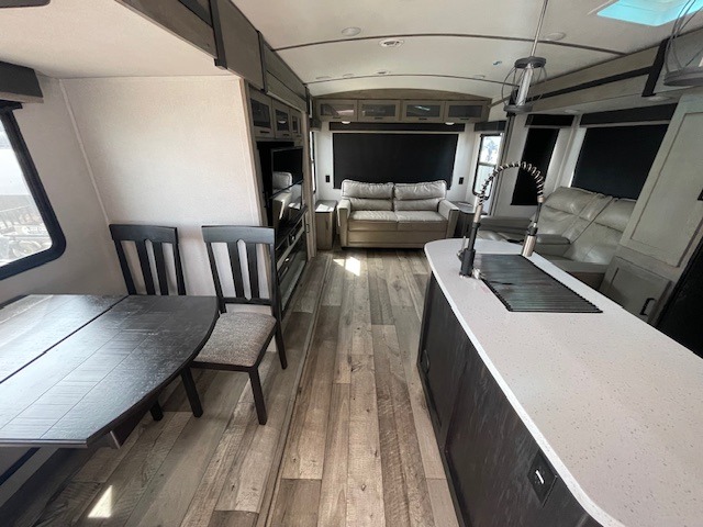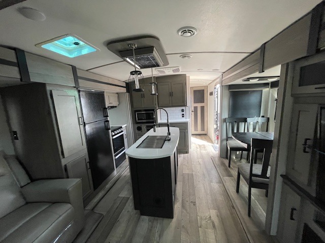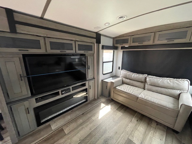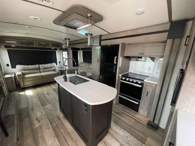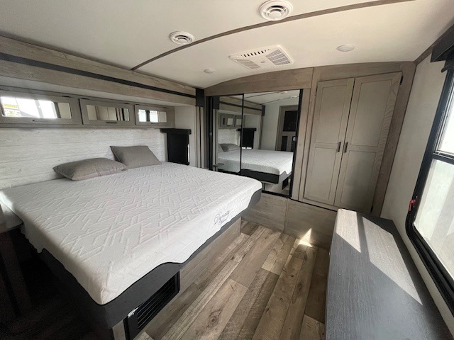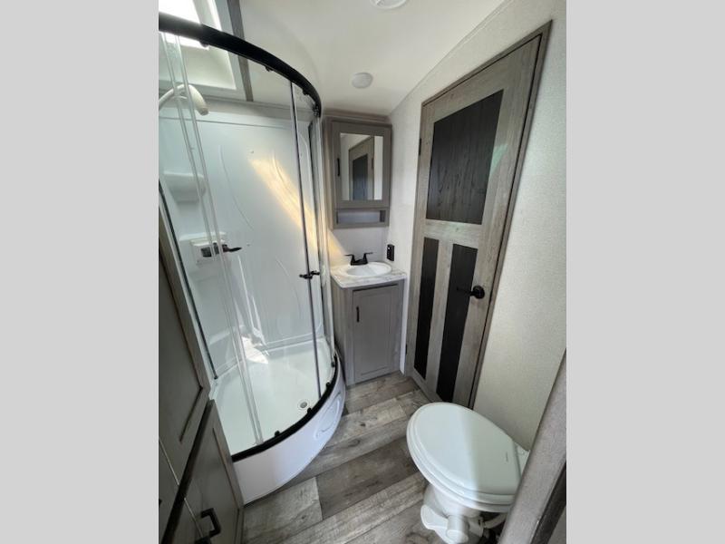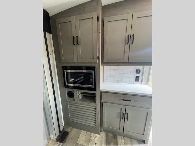 With any Keystone Outback travel trailer and toy hauler you will enjoy a lighter wallboard and white countertops for the modern farmhouse feel with more refined flooring, furniture, and cabinet hardware. You can extend your camping season thanks to the Astro-foil barrier added to the fully enclosed underbelly with ducted heat, the Coleman-Mach Quiet Series A/C offering a significant reduction of in-cabin sound levels, and an upgraded 10 cu. ft. 12V GE refrigerator to mention a few notables. The Lippert Step Above entry steps, the water docking station, the rear ladder, and the HyperDeck high performance, water-resistant RV floor are a few more reasons you will want to own an Outback for years to come!