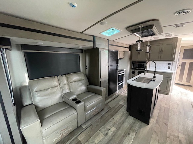 Take your camping expeditions to the next level with this Outback travel trailer! Your family's master chef will appreciate all of the appliances that have been included in both the indoor and outdoor kitchen, like the pantry, the three-burner range top, the kitchen island, and the double door refrigerator. The large skylight located above the island will brighten up the interior with the sun's rays during the day and will allow the glow from the moon to illuminate the space at night. For a comfortable place to spend your evenings, you will love your own king-size bed slide in the private master suite while your guests or kids sleep on the sofa sleeper and booth dinette and someone might even try to sleep on the theater seats. There are options to choose from such an 8 cu. ft. refrigerator in place of the 10 cu. ft. refrigerator and/or a table and chairs in place of the booth dinette.