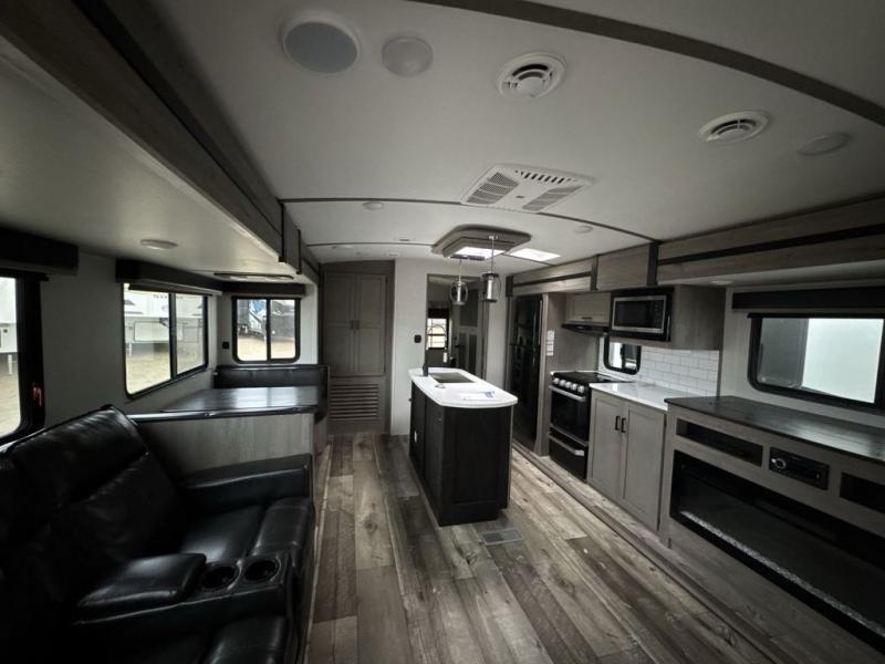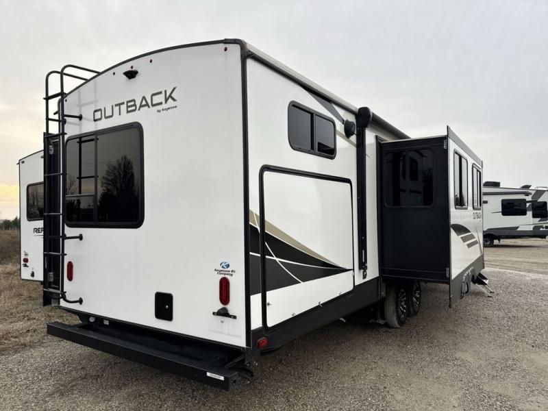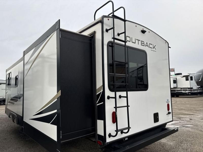 Let this Outback travel trailer be your family's new favorite vacation destination! Whether it is in the rear private bunkhouse or in the front private bedroom, you will find plenty of space to sleep nine to ten people throughout this trailer, and because this unit comes with a built-in kennel, you will also have plenty of space for your pet to feel comfortable while you travel. With the three slides that have been included in this model, you will be able to rest easily in the central living area on the sofa sleeper or booth dinette while you charge your computer or cell phone at the power station. The cook will love having the choice of cooking indoors or outdoors, and you will have the choice of adding an option or two such as a different size refrigerator, theater seating in place of the sofa, and there is more.