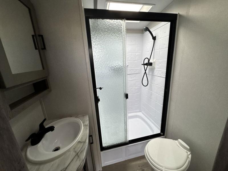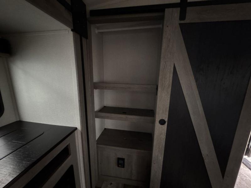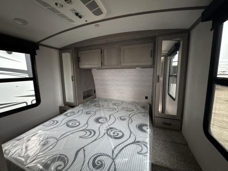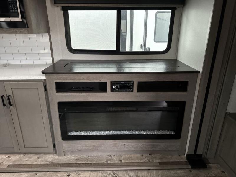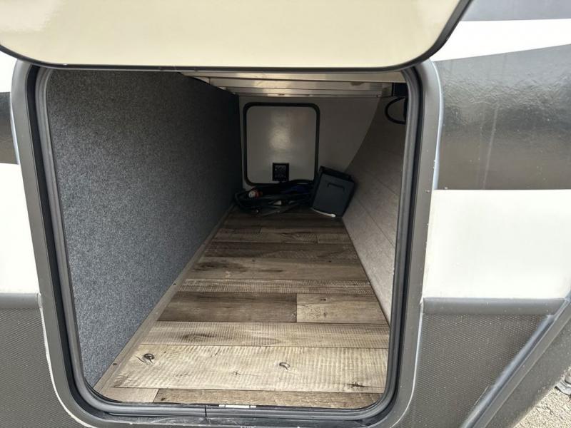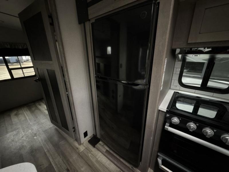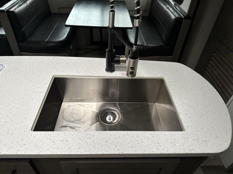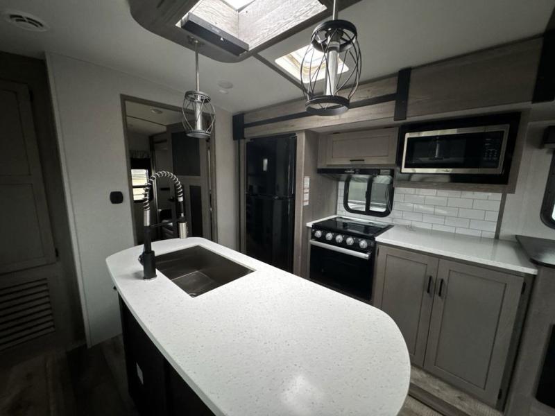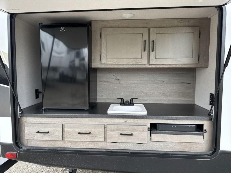 With any Keystone Outback travel trailer and toy hauler you will enjoy a lighter wallboard and white countertops for the modern farmhouse feel with more refined flooring, furniture, and cabinet hardware. You can extend your camping season thanks to the Astro-foil barrier added to the fully enclosed underbelly with ducted heat, the Coleman-Mach Quiet Series A/C offering a significant reduction of in-cabin sound levels, and an upgraded 10 cu. ft. 12V GE refrigerator to mention a few notables. The Lippert Step Above entry steps, the water docking station, the rear ladder, and the HyperDeck high performance, water-resistant RV floor are a few more reasons you will want to own an Outback for years to come!
