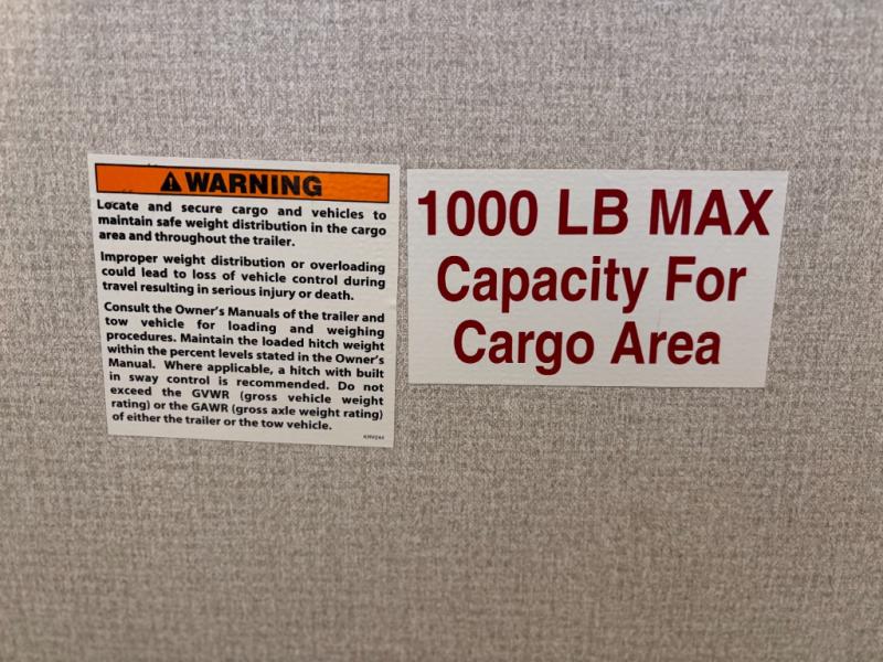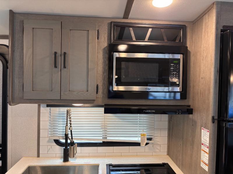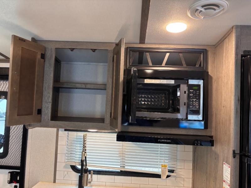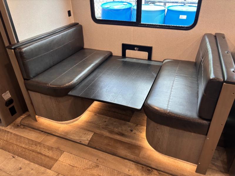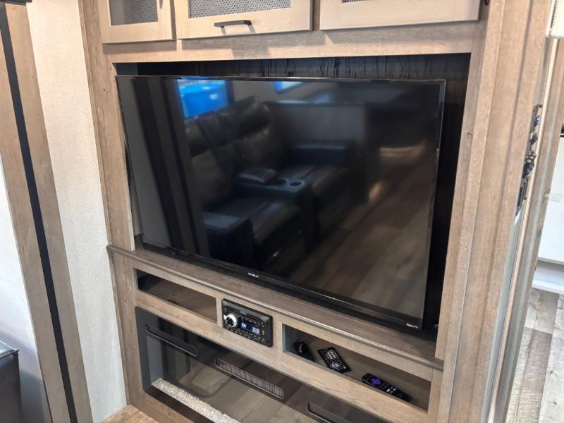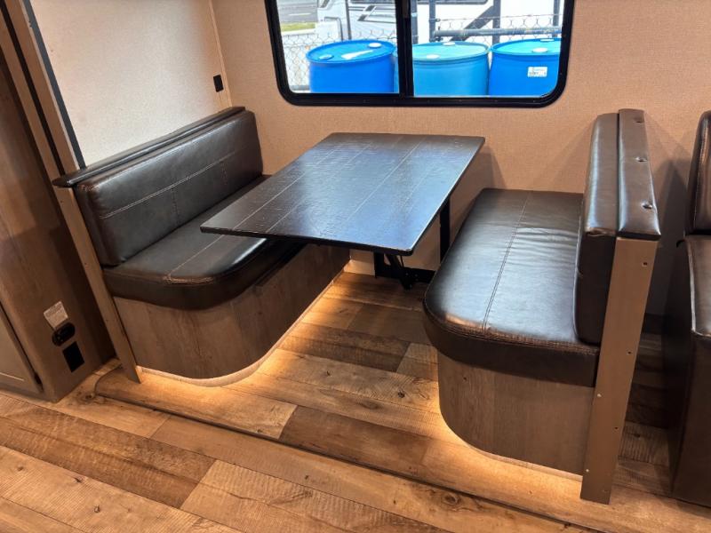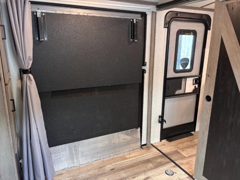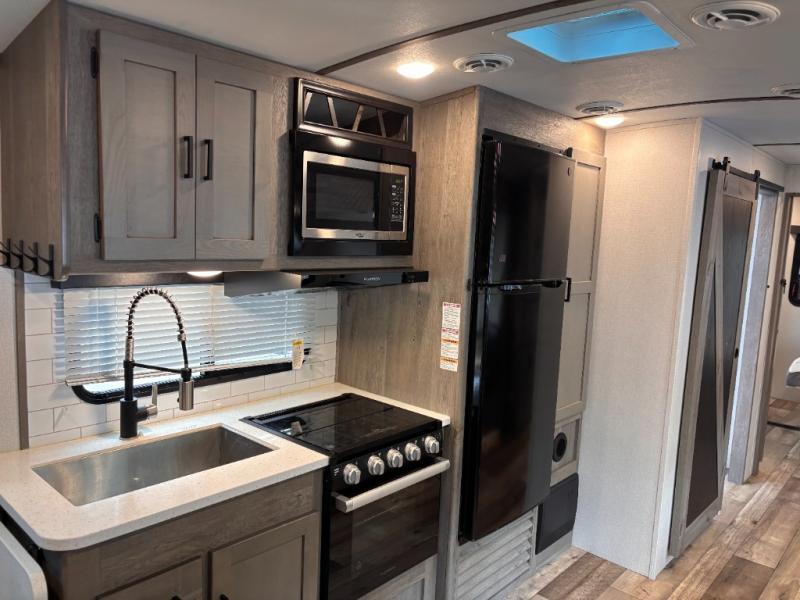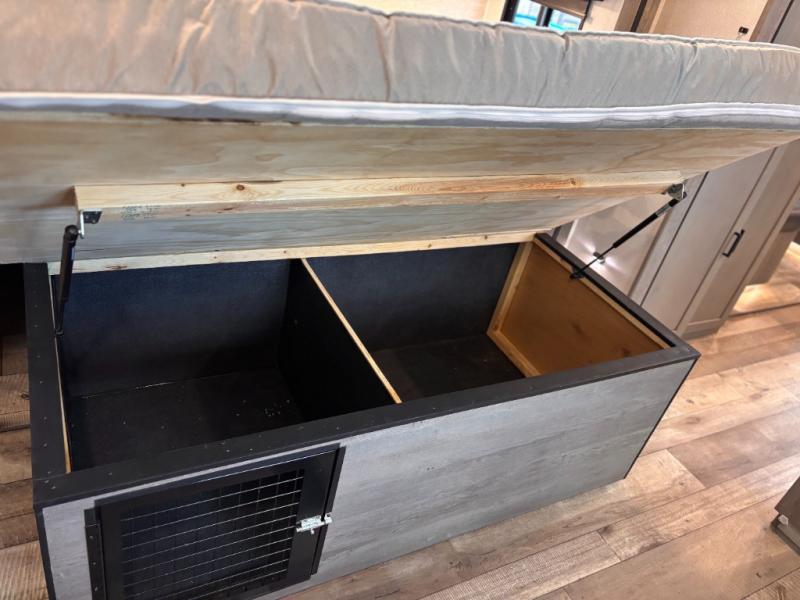 This travel trailer toy hauler allows you to load up your toys along the side using the 56" ramp door with extension as well as allows a person in a wheelchair access inside through the front cargo garage, plus there are flip-down bunk beds, a wardrobe and a barn slider door leading into the main living and kitchen area. You will find a sofa sleeper and booth dinette slide, a 50" HDTV with fireplace below, and full kitchen amenities for the cook to make meals, store leftovers and clean up dishes. The full bathroom will keep everyone clean after the rides or hikes, and the rear master bedroom allows you to sleep like a king while your pet has their own space in the built-in pet kennel. Having dual entry doors makes loading and unloading easy and provides a smooth flow of traffic. There are options to choose from if you would prefer a table and chairs in place of the booth dinette, theater seating in place of the sofa sleeper, and/or an 8 cu. ft. refrigerator.