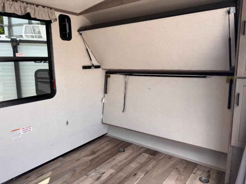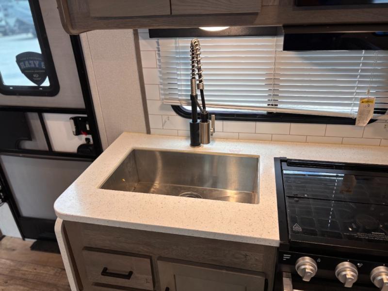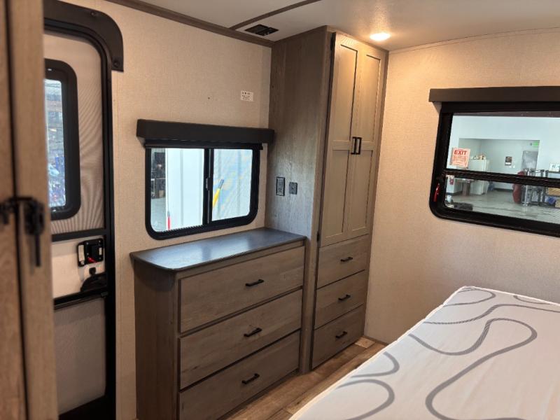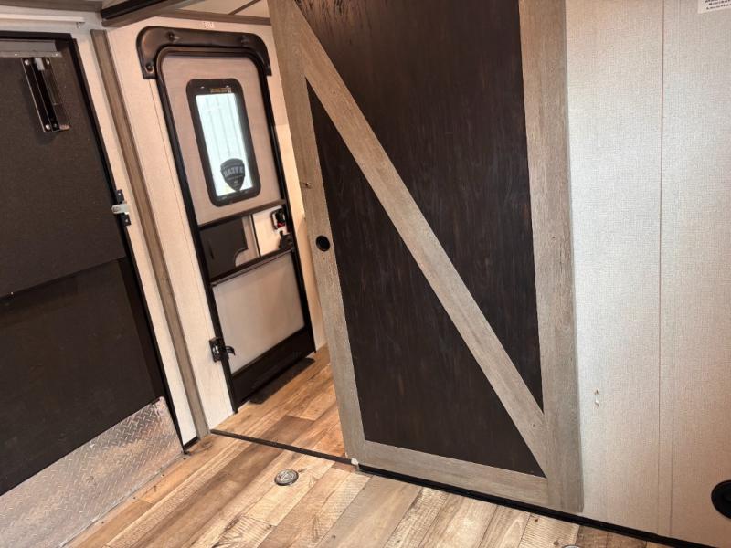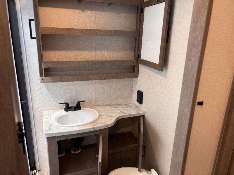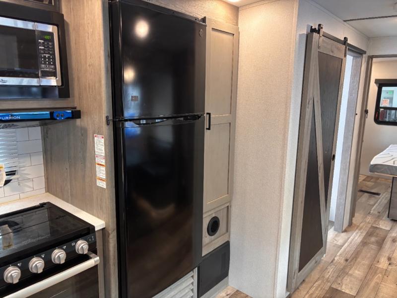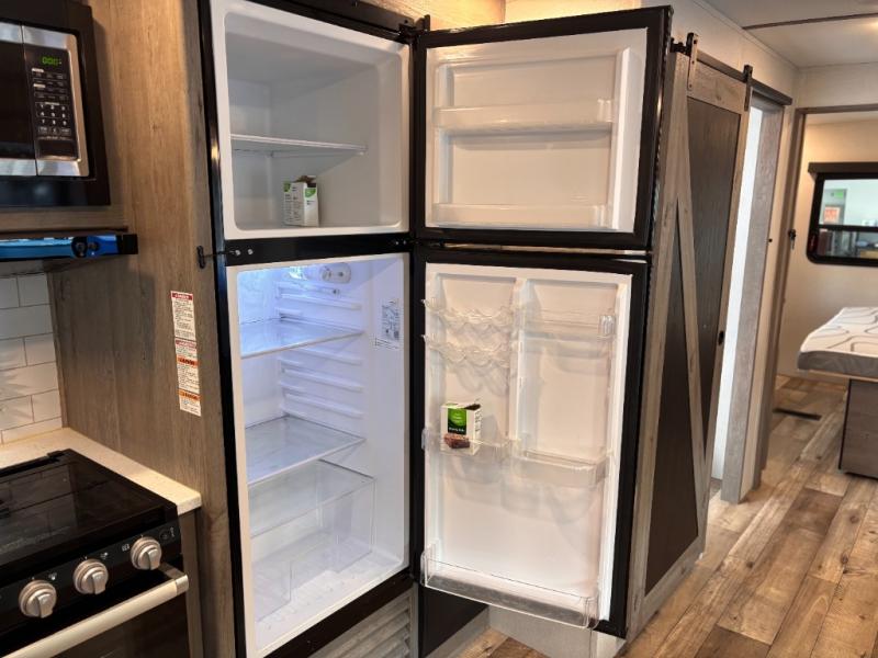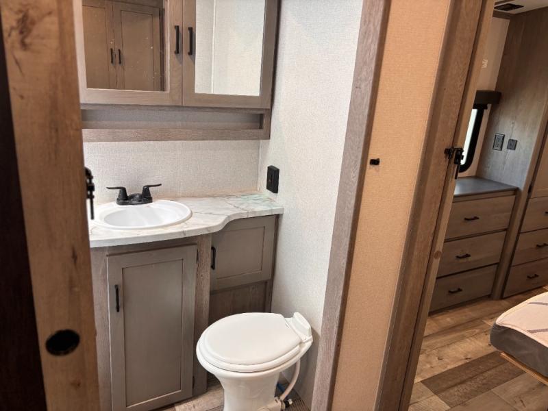 This travel trailer toy hauler allows you to load up your toys along the side using the 56" ramp door with extension as well as allows a person in a wheelchair access inside through the front cargo garage, plus there are flip-down bunk beds, a wardrobe and a barn slider door leading into the main living and kitchen area. You will find a sofa sleeper and booth dinette slide, a 50" HDTV with fireplace below, and full kitchen amenities for the cook to make meals, store leftovers and clean up dishes. The full bathroom will keep everyone clean after the rides or hikes, and the rear master bedroom allows you to sleep like a king while your pet has their own space in the built-in pet kennel. Having dual entry doors makes loading and unloading easy and provides a smooth flow of traffic. There are options to choose from if you would prefer a table and chairs in place of the booth dinette, theater seating in place of the sofa sleeper, and/or an 8 cu. ft. refrigerator.