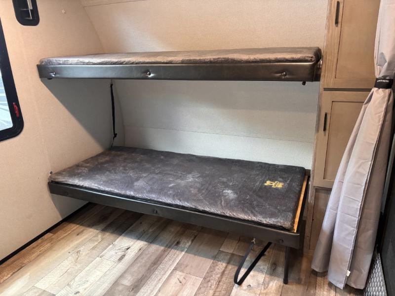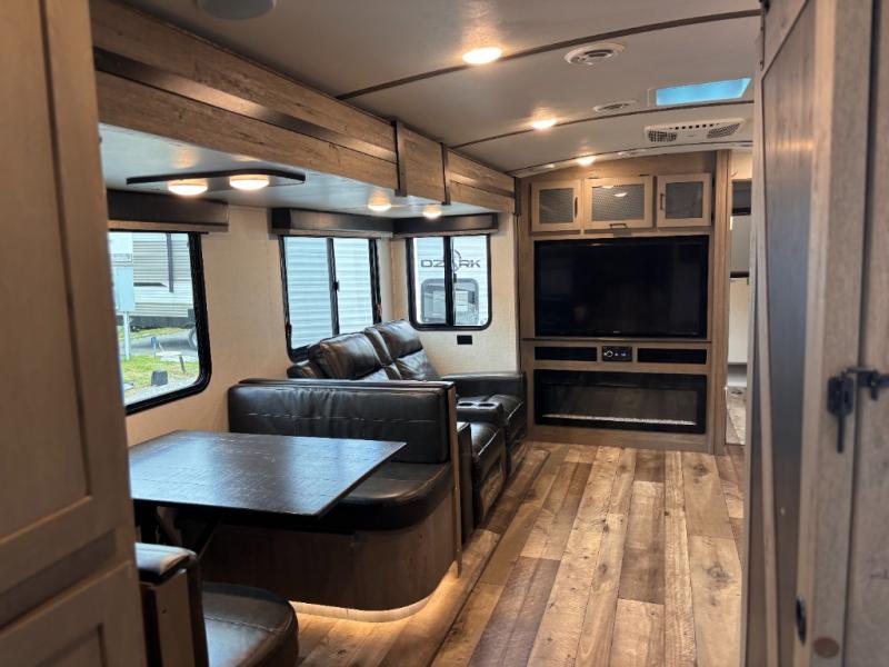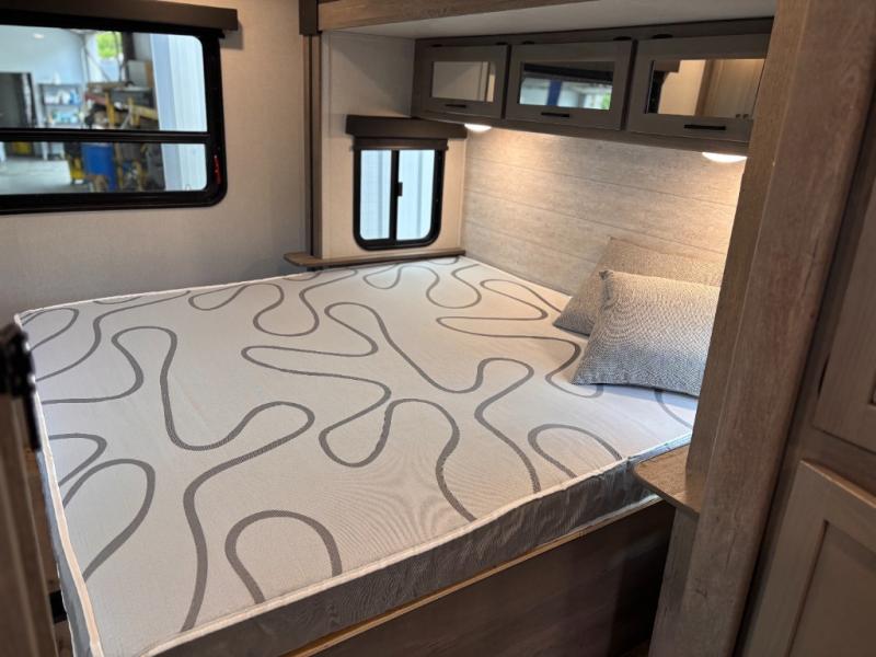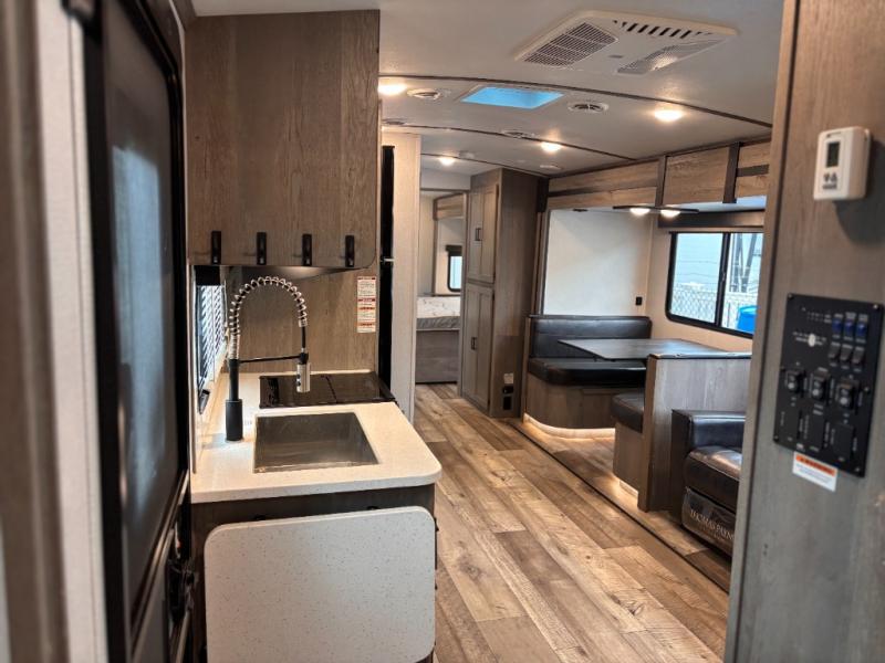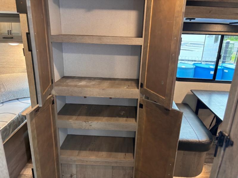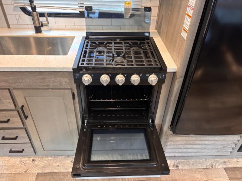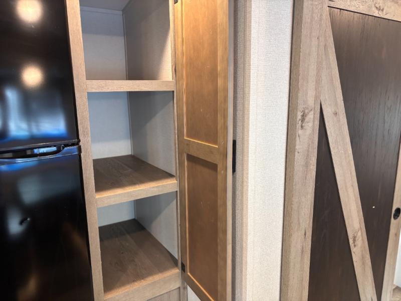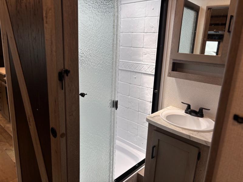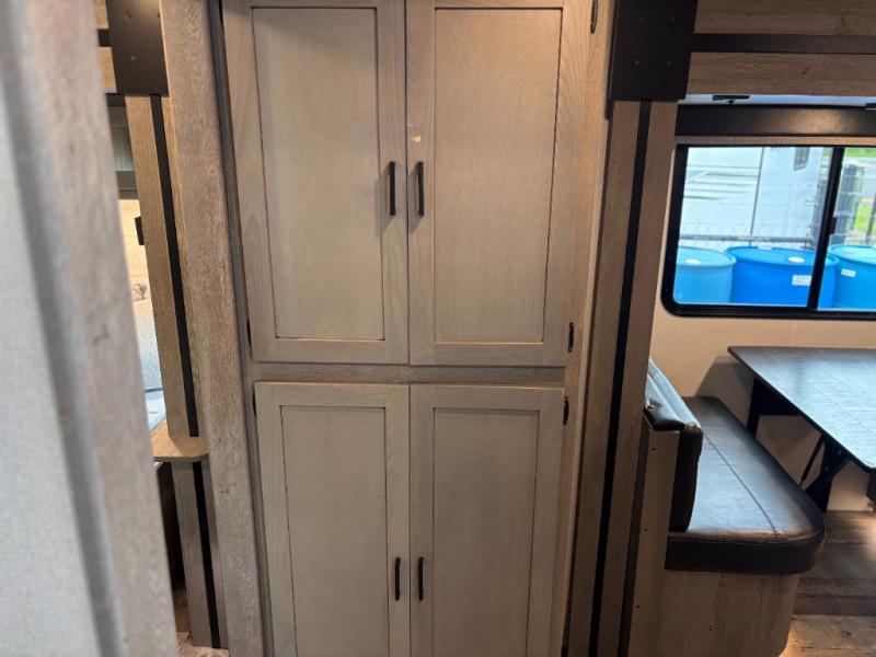 This travel trailer toy hauler allows you to load up your toys along the side using the 56" ramp door with extension as well as allows a person in a wheelchair access inside through the front cargo garage, plus there are flip-down bunk beds, a wardrobe and a barn slider door leading into the main living and kitchen area. You will find a sofa sleeper and booth dinette slide, a 50" HDTV with fireplace below, and full kitchen amenities for the cook to make meals, store leftovers and clean up dishes. The full bathroom will keep everyone clean after the rides or hikes, and the rear master bedroom allows you to sleep like a king while your pet has their own space in the built-in pet kennel. Having dual entry doors makes loading and unloading easy and provides a smooth flow of traffic. There are options to choose from if you would prefer a table and chairs in place of the booth dinette, theater seating in place of the sofa sleeper, and/or an 8 cu. ft. refrigerator.