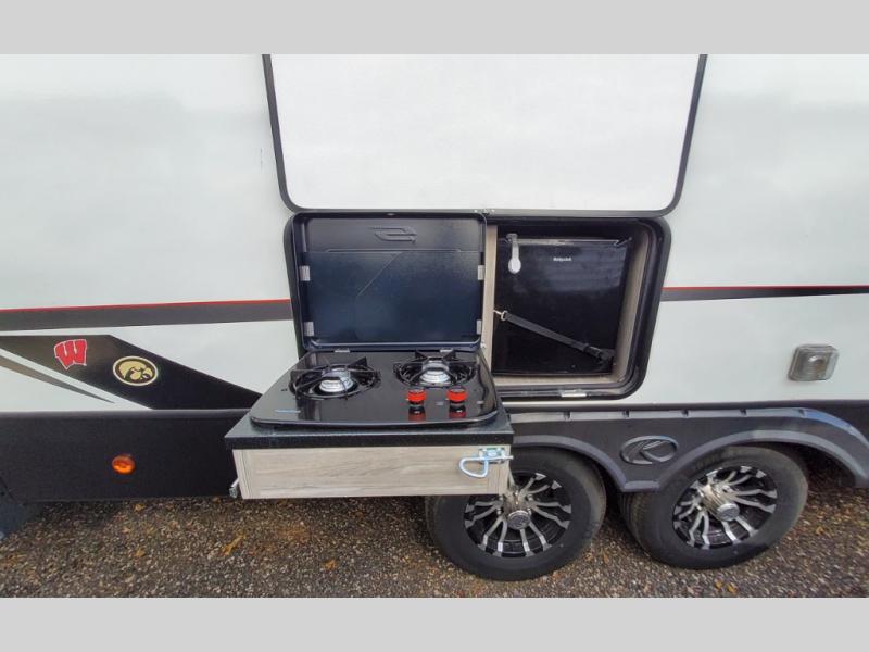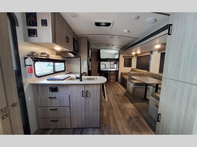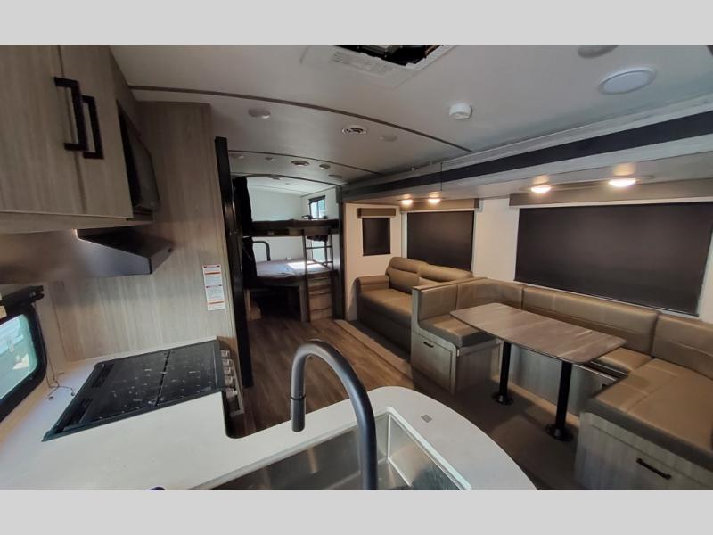 This Passport travel trailer has tons of sleeping space so that everyone is comfortable when you travel! There is a set of double-size bunks, and the bottom bunk can flip up so that you can store things in the rear cargo door. The tri-fold sleeper sofa and U-shaped dinette can be replaced by the optional Pivot furniture which gives you the opportunity to flip it back and forth as you need it to function. The front private bedroom gives you a secluded space to spend your nights in peace and quiet, and when you need some more charcoal or lawn chairs, just check the exterior pass-through storage compartment.