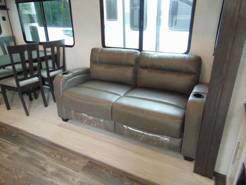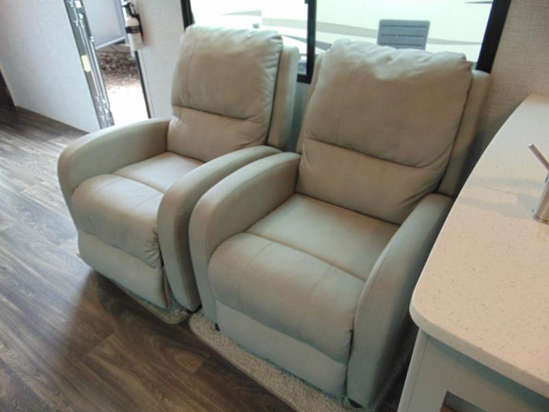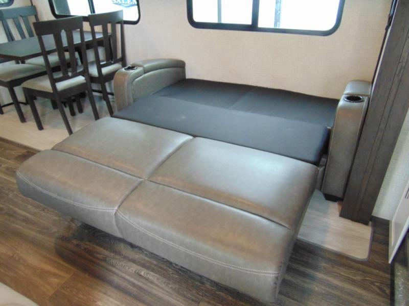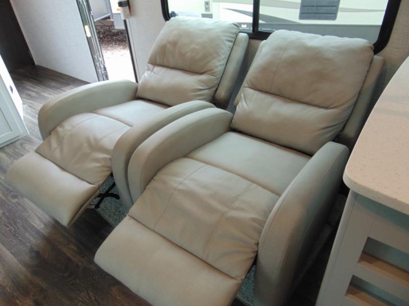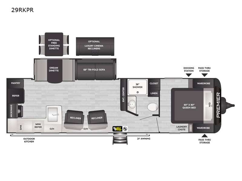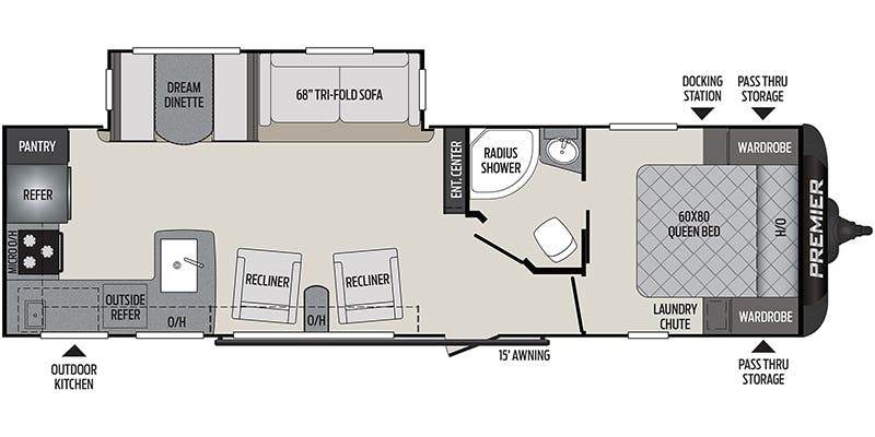 This travel trailer will be your luxury home away from home! It features a front private bedroom that has a queen bed with wardrobes on either side and a laundry chute on one side for your convenience. The full bathroom has a 36" shower to rinse off in and a linen closet to store your towels. You can choose to cook either in the rear kitchen with plenty of countertop space or breathe in some fresh air while you use the outside kitchen. When you're ready to wind down your nights, head to the living area and relax in either one of the two recliners, play a card game at the Dream Dinette which can be replaced for an optional free standing dinette, or lay on the 68" tri-fold sofa that can be switched out for the optional luxury cinema recliners!