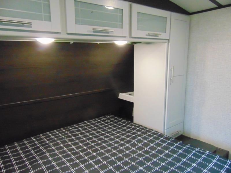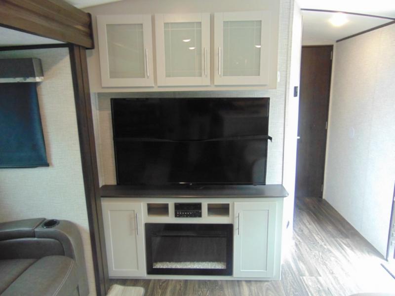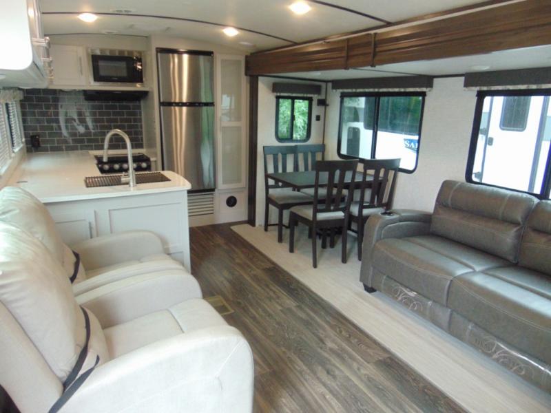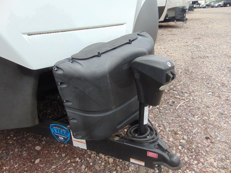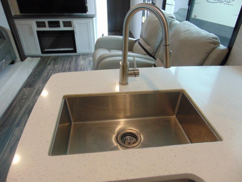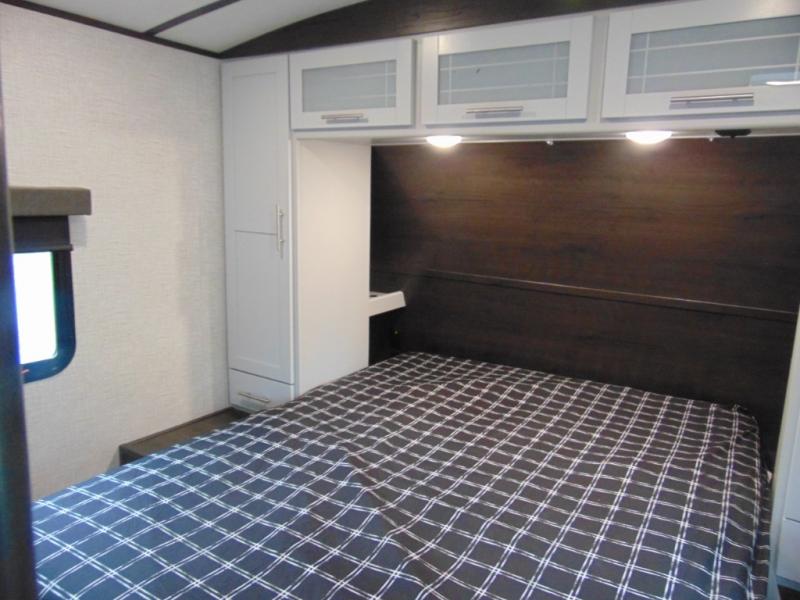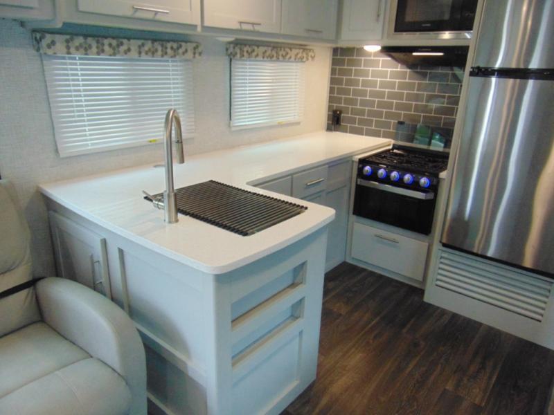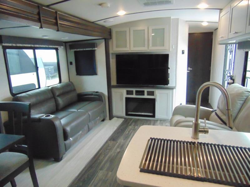 What I liked most: Very spacious. Love the large indoor counter space in the kitchen and the double sink w/ retractable faucet head. Tons of storage compartments literally everywhere. The pantry storage is very large and deep. Love having the 2 chairs aside from the sofa and dinette area, which can be easily taken out if you need more room. We travel with 2 labs and their crates fit perfectly and they love it too. Bathroom is quite spacious and you get a pretty decent hot shower. I love that there is a door for the bedroom for added privacy. Nice to have mirrored cabinets in the bedroom, you can see yourself from head to toe. Tows very very nice with my 11'GMC Sierra w/ the 6.2, HD towing pkg.