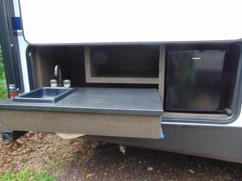 What I'd improve: The outdoor kitchen would be better if there were even a single burner. But the grill, sink, counter and fridge sure are nice, especially when it is hot outside. It would also be better if you didn't have to close both kitchen windows to open and use the outdoor kitchen. The entry stairs are kinda steep, very shallow. It would be better if the outer door had pivot hinges with a magnet so it would lay flush to the camper exterior to help with airflow.9 years ago | Debbie G. from Marlette, MI